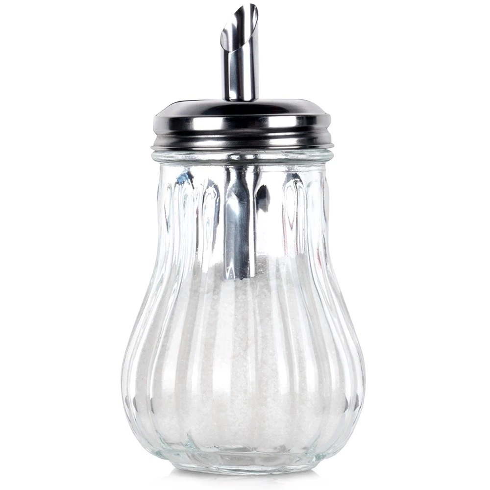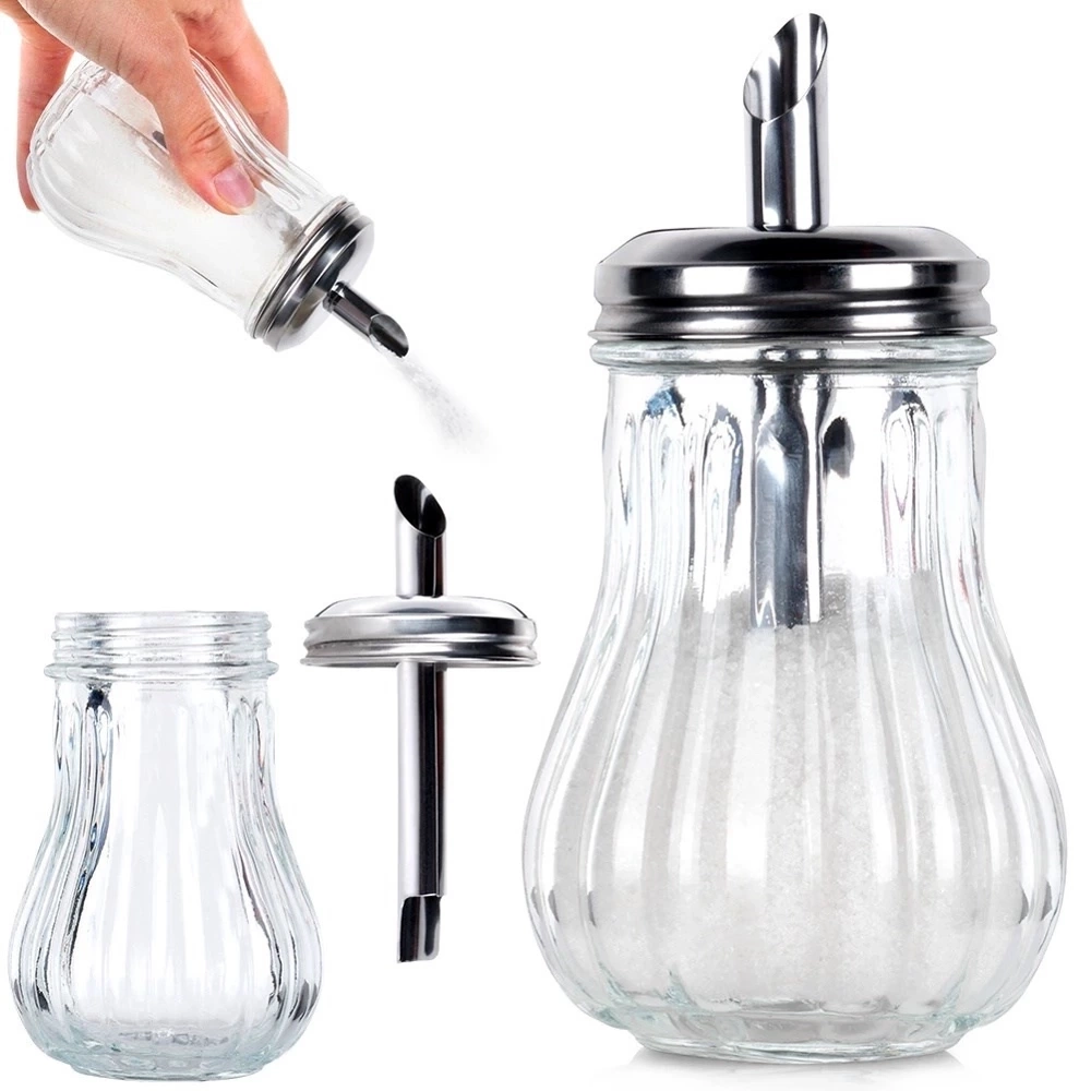 - Cukierniczka z dozownikiem, doskonała do przechowywania i serwowania cukru. Wykonana ze szkła oraz stali nierdzewnej. Dzięki niej nasypiemy zawsze taką samą ilość cukru.