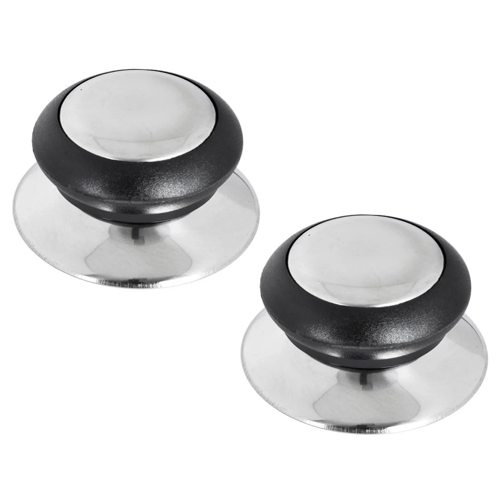 - Zestaw dwóch uchwytów zamiennych do pokrywek wraz ze śrubami. Wykonana ze stali nierdzewnej oraz tworzywa. Gałki odpowiednie dla pokryw o średnicy od 14 do 30 cm.