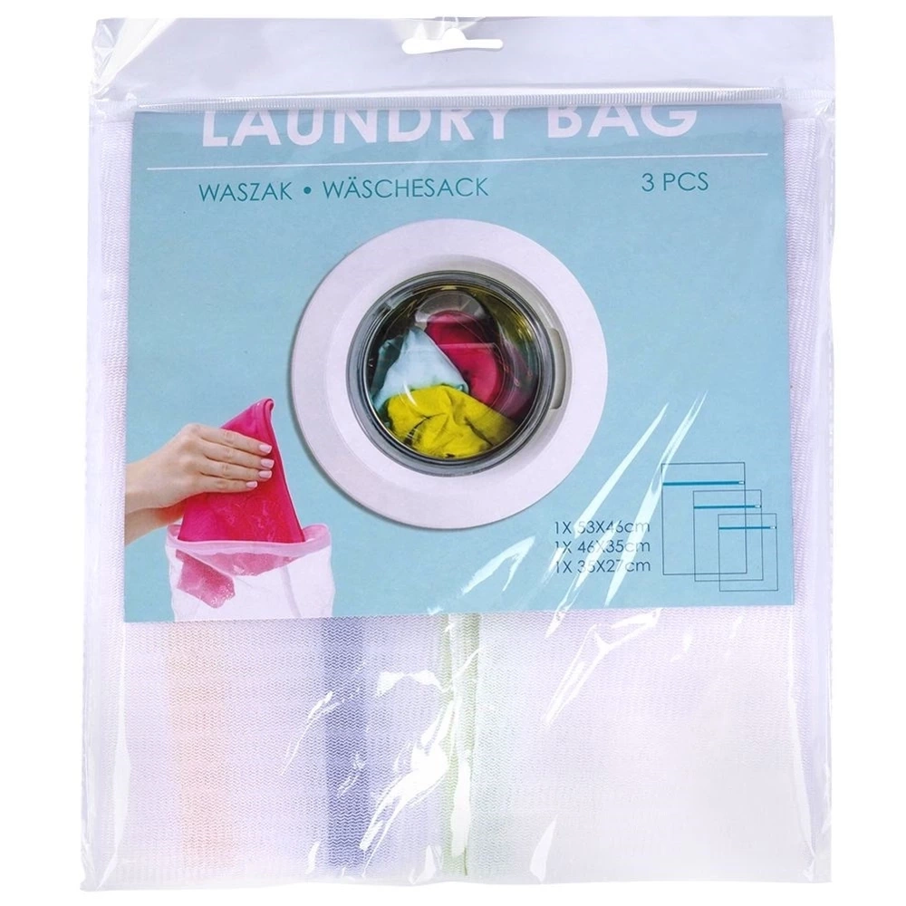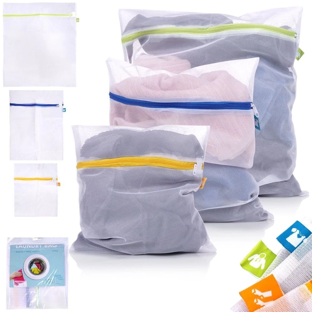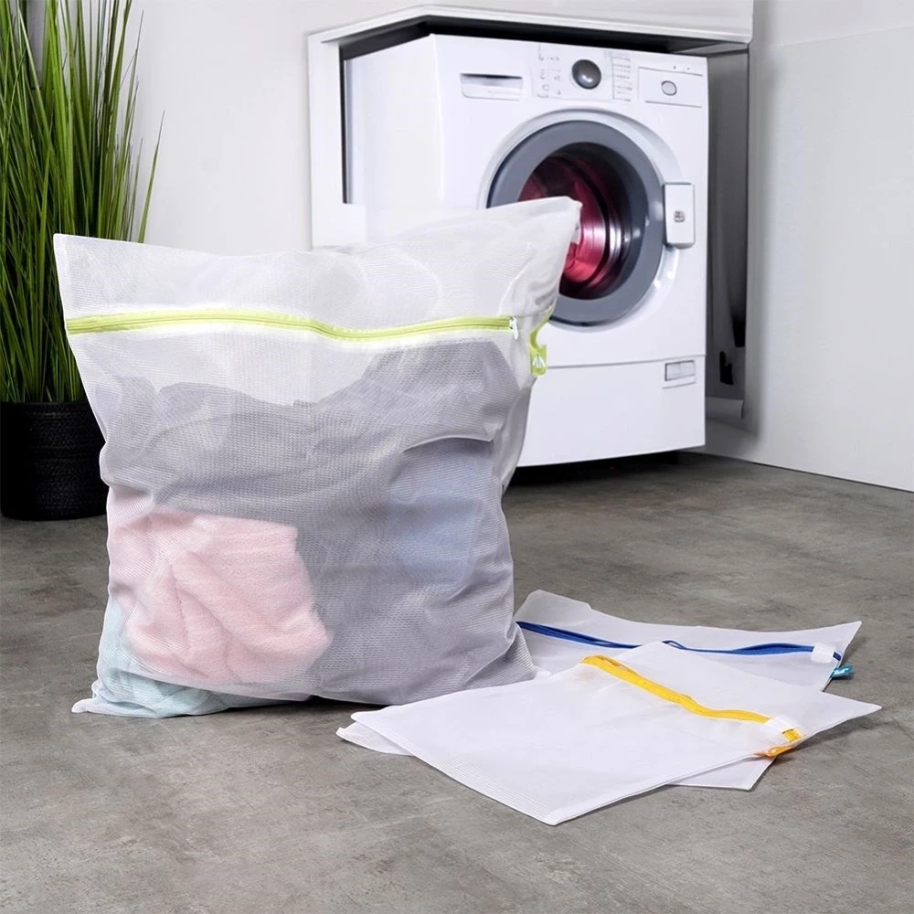 - Zestaw trzech worków do prania. Idealnie nadają się do prania biustonoszy i innych delikatnych tkanin. Siatki są wyposażona w plastikowy suwak, aby nie uszkodzić prania.