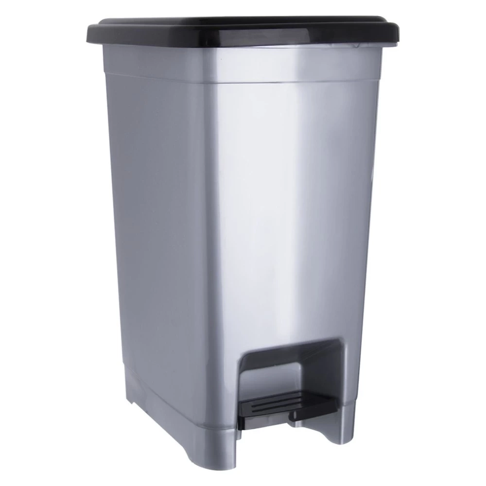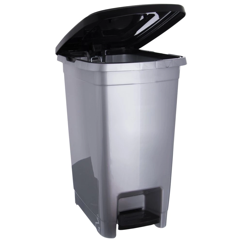 - Praktyczny, wąski kosz na śmieci, otwierany za pomocą pedała. Wykonany z wytrzymałego tworzywa w szarym kolorze. Posiada uchwyty utrzymujące worek na śmieci.