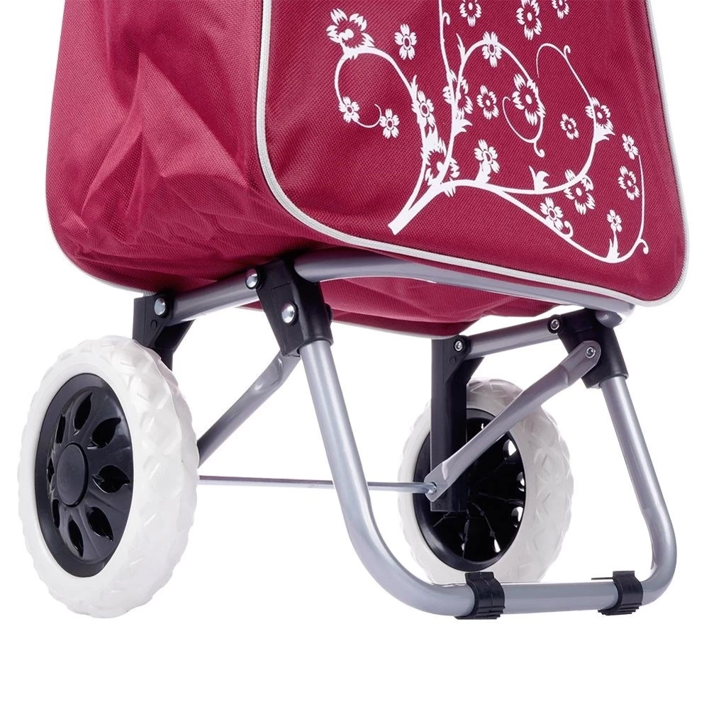- POJEMNA TORBA - Torba z wózka ma kolor bordowy i efektowny dekor. Dla komfortu użytkowania zamykana jest na sznurek. Posiada również tylną kieszeń, która jest zamykana na zamek.
