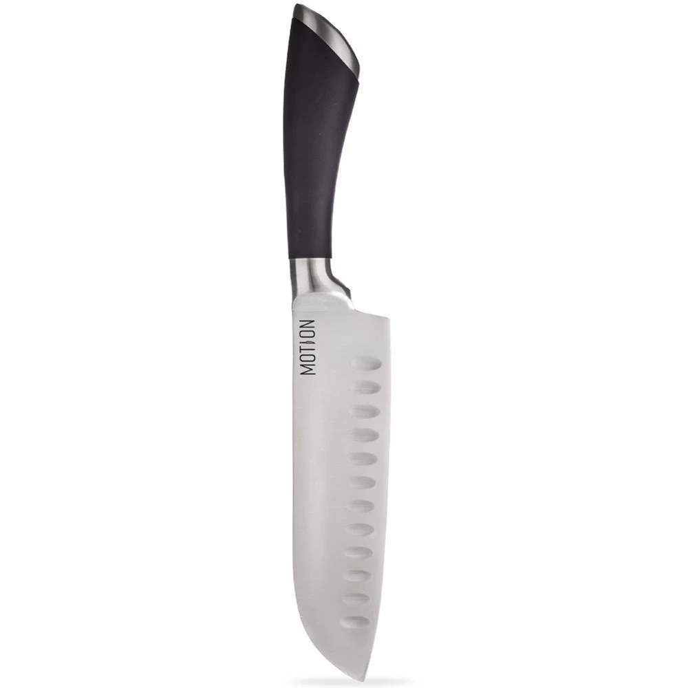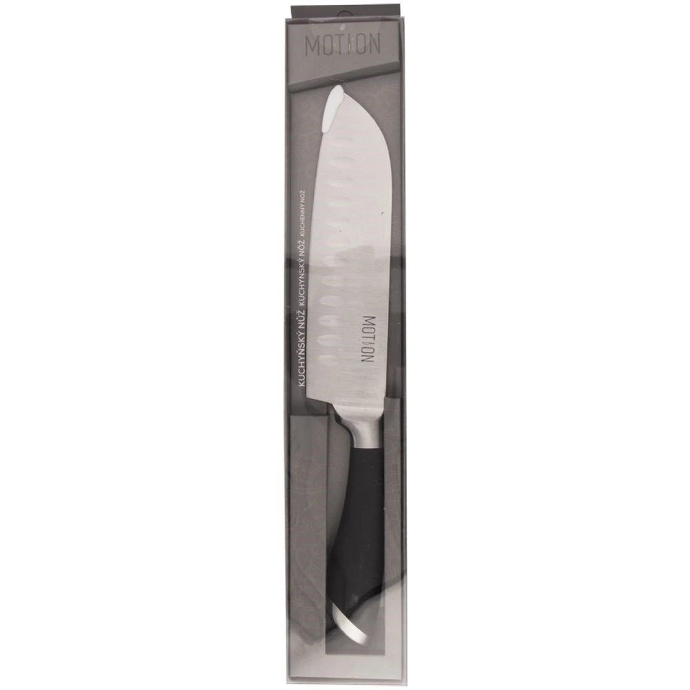 - STALOWY - Nóż typu Santoku z serii Motion. Nóż o długości 31 cm a ostrze noża wynosi 17 cm. Wykonany z wysokiej jakości stali nierdzewnej.