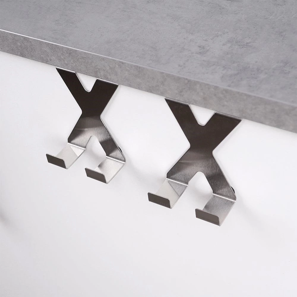 Zestaw dwóch, bezinwazyjnych wieszaków zawieszanych na drzwi. Haczyki są podwójne i umożliwiają zawieszenie dwóch różnych przedmiotów na drzwiach, drzwiczkach szafki, kaloryferze lub grzejniku. Polecane szczególnie do małych łazienek, gdzie brakuje miejsca na tradycyjne wieszaki lub suszarki. Srebrny kolor pasuje do każdego wnętrza. Z ich pomocą zyskamy dodatkową przestrzeń do przechowywania np. ręczników. Wyprodukowano zgodnie z europejskimi standardami.