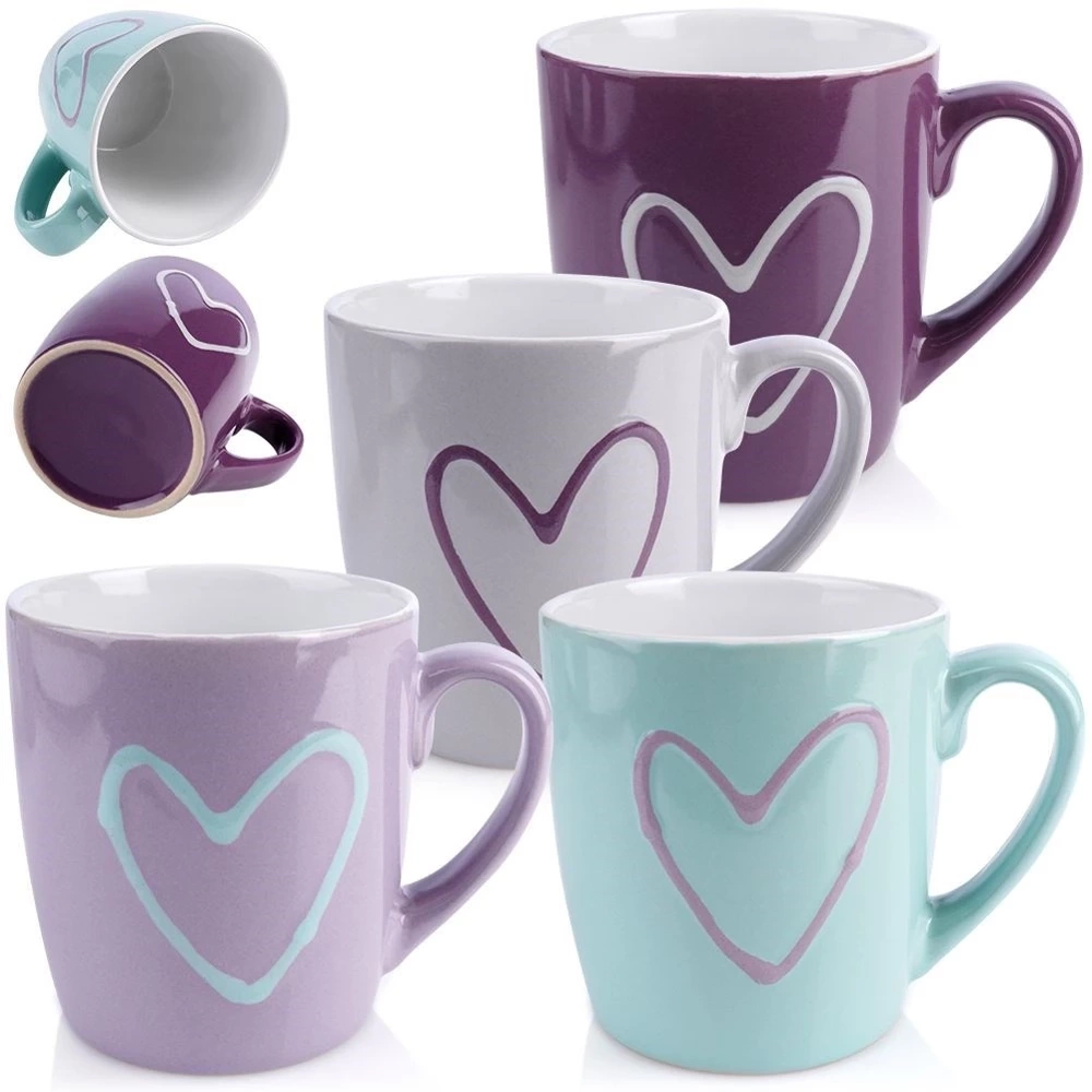 - Zestaw kolorowych kubków z dekorem serca. Wykonane z ceramiki, wyposażone w wygodne uchwyty. Idealne do picia kawy, herbaty i innych napojów.