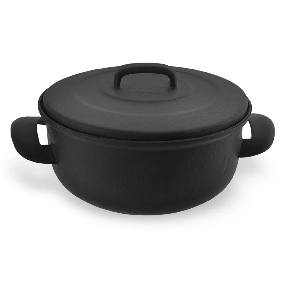 - Czarny garnek, wykonany z bardzo grubej stali emaliowanej, imitującej żeliwo - czeskie żeliwo. Sprawdzi się na wszystkich rodzajach kuchenek oraz w piekarniku.
