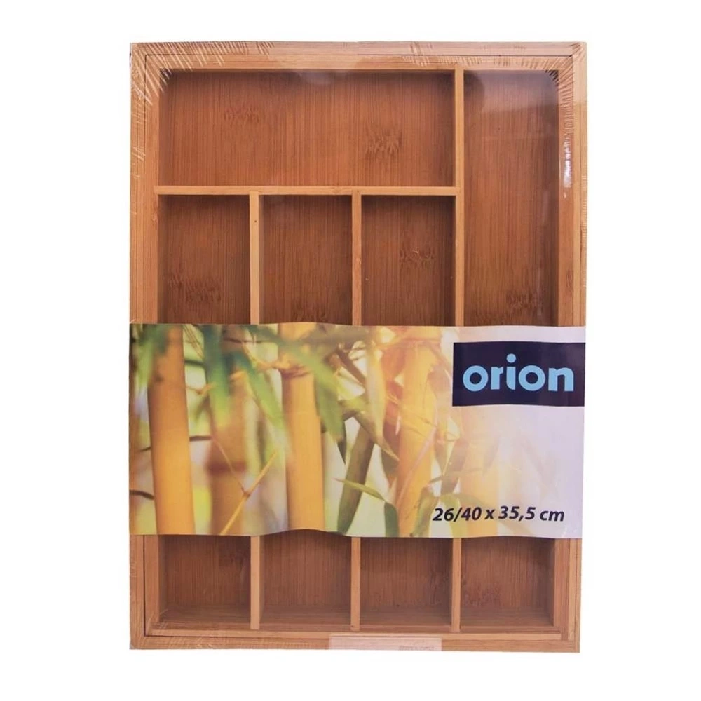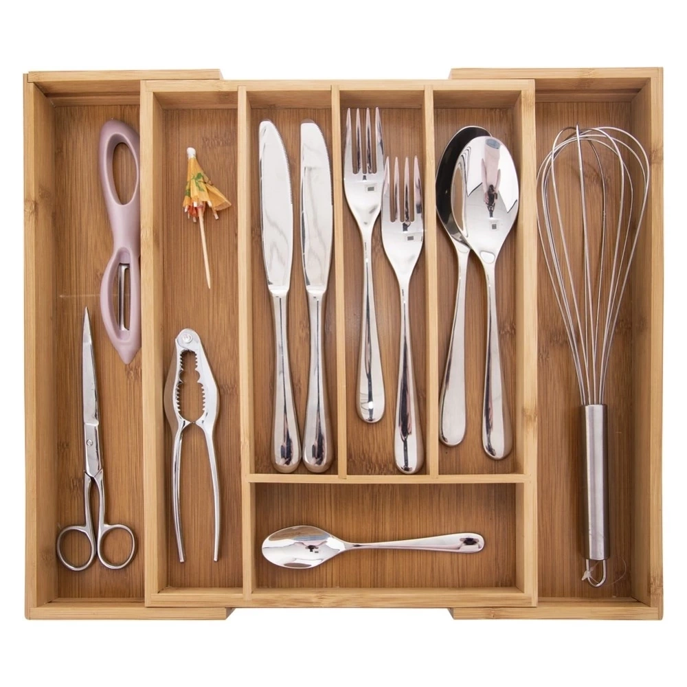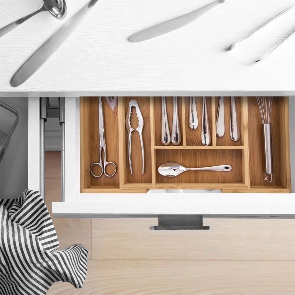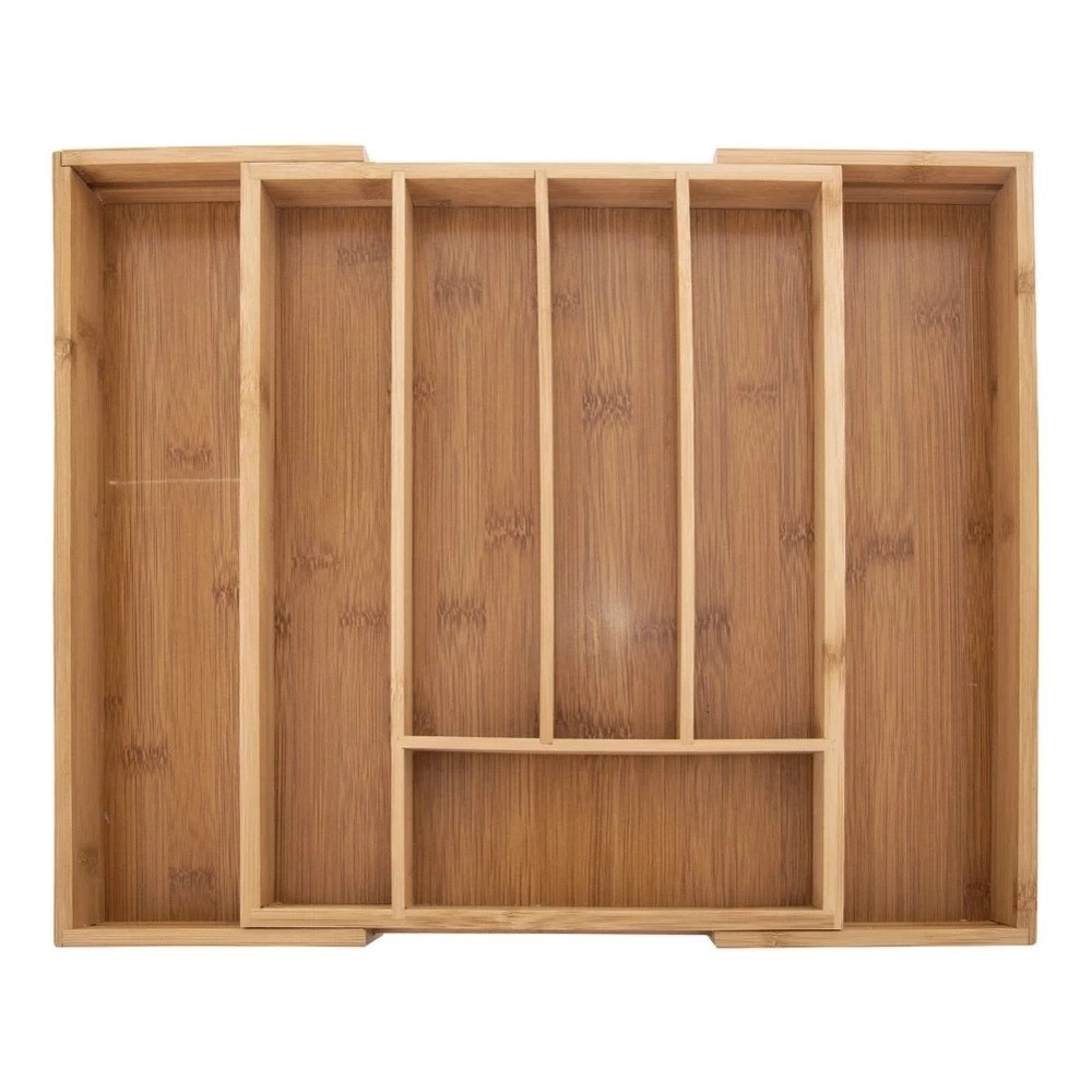 - Regulowany organizer na sztućce oraz przybory kuchenne do szuflady wykonany z drewna bambusowego. W zależności od ustawienia posiada od 5 do 7 przegródek.