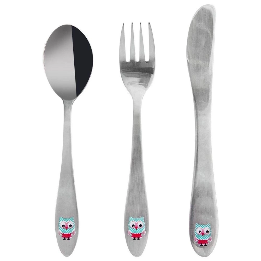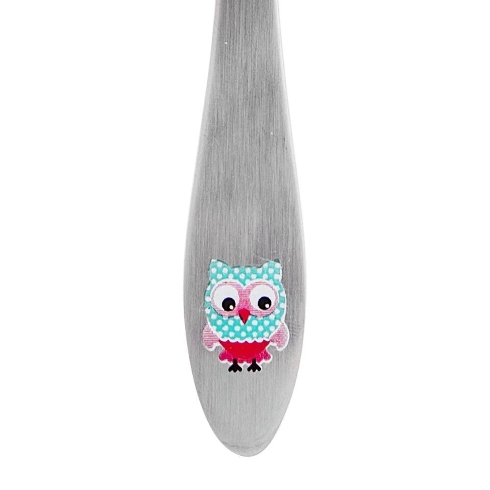 - Trzyelementowy zestaw sztućców dla dziecka z motywem sowy. W komplecie znajduje się widelec, łyżka oraz nóż. Odpowiednio wyprofilowane i lekkie, nie mają ostrych krawędzi.