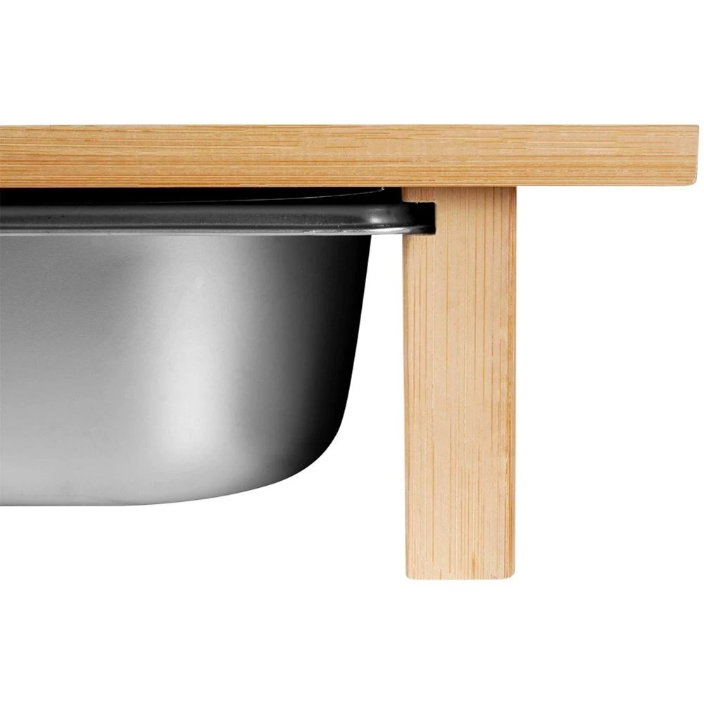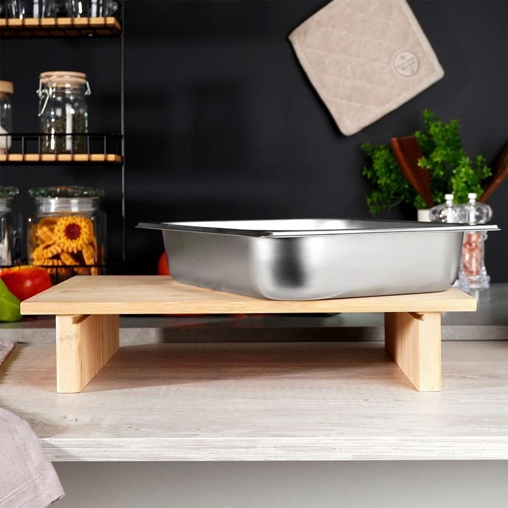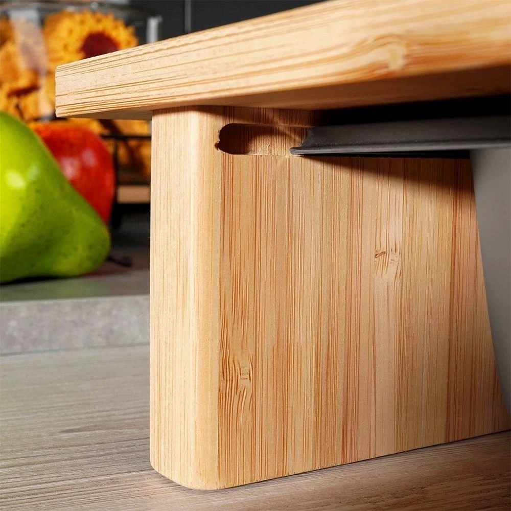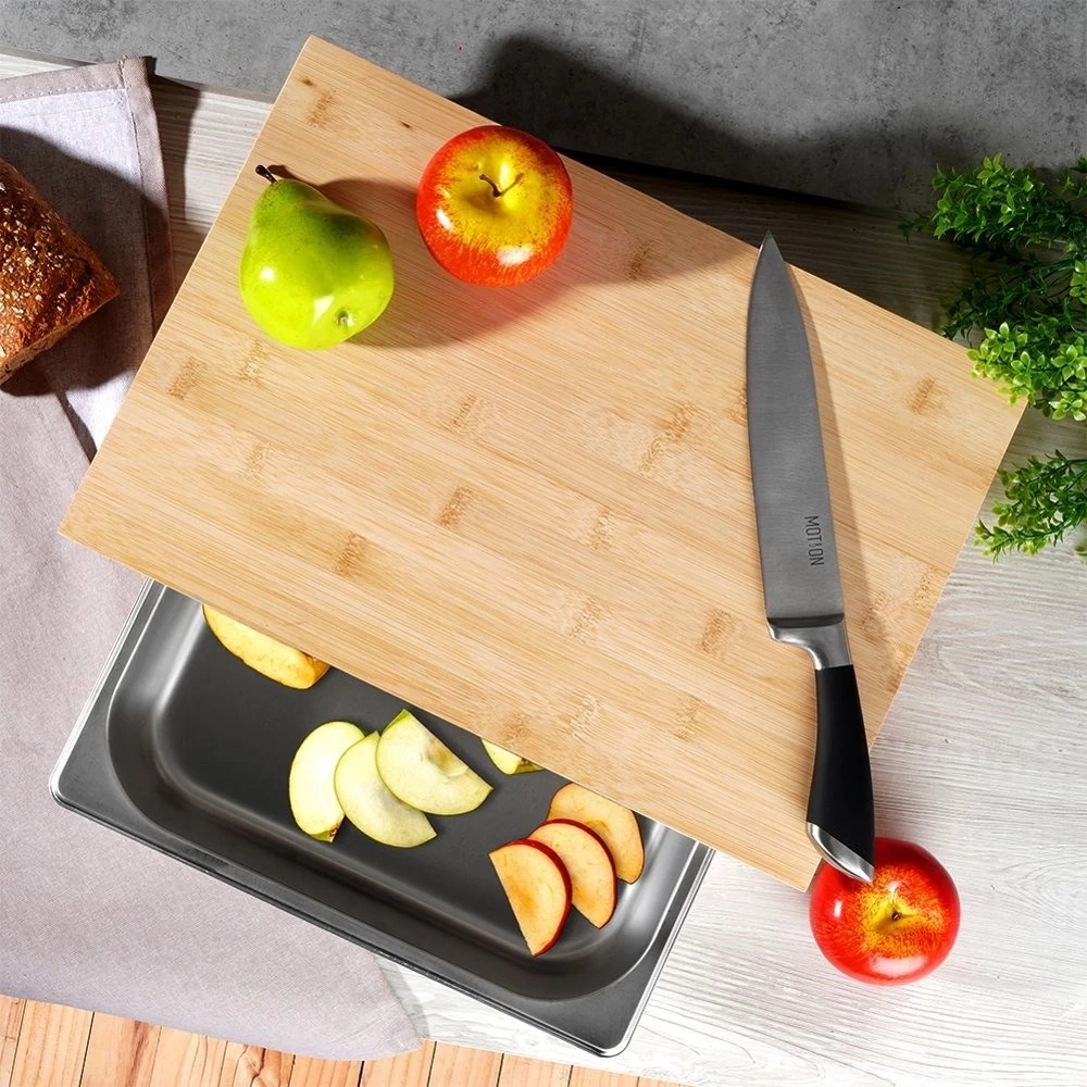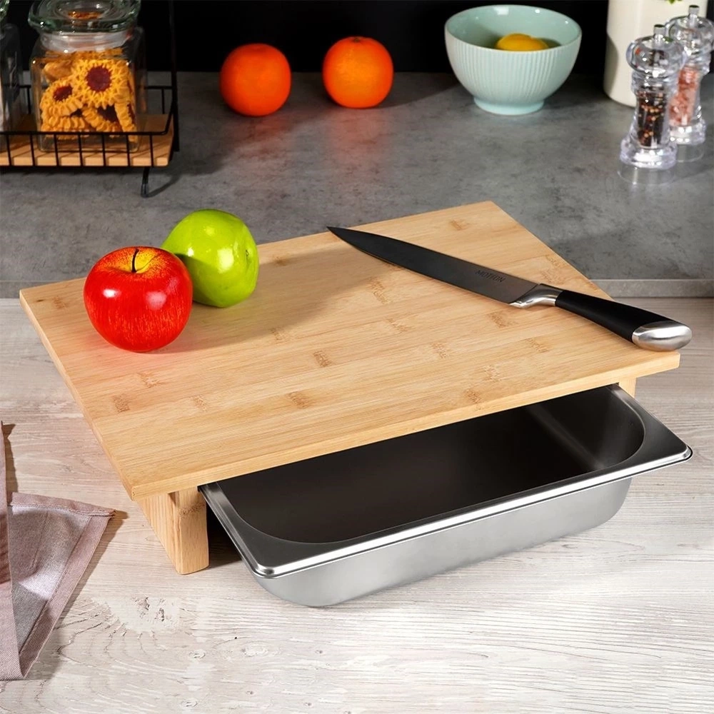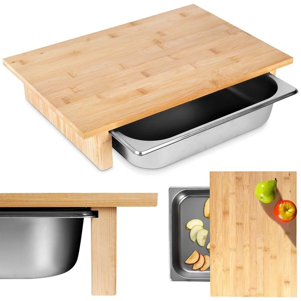 - Bambusowa deska do krojenia z wysuwanym stalowym pojemnikiem. Produkt niezwykle praktyczny, zajmuje mało miejsca. Pokrojone składniki od razu możemy wrzucić do pojemnika.