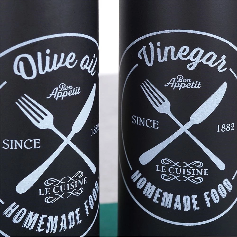 - SOLIDNE - Butelki wykonane z wysokiej jakości szkła, z metalową obudową w modnym, czarnym kolorze. Białe nadruki precyzyjnie określają przeznaczenie, ułatwiając odróżnienie oliwy od octu.