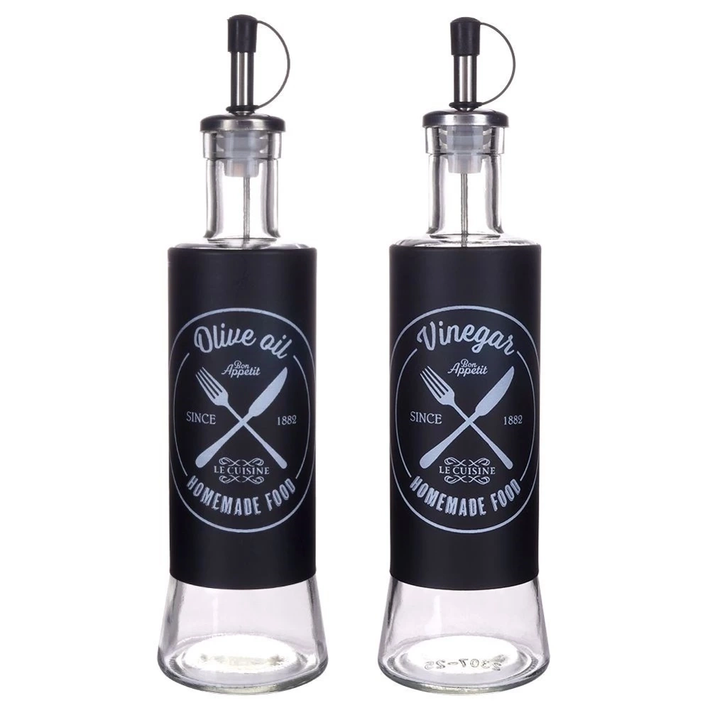 Zestaw dwóch butelek z dozownikami do oliwy i octu. Wykonane z solidnych materiałów. Zestaw będzie ozdobą zarówno stołu, jak i kuchni. Dzięki butelkom będziemy w odpowiedni sposób przechowywać oliwę oraz ocet. Zakończone są praktycznym dozownikiem, który pomoże uniknąć rozlania zawartości i pozwala odmierzyć odpowiednią ilość. Wyprodukowano zgodnie z europejskimi standardami.