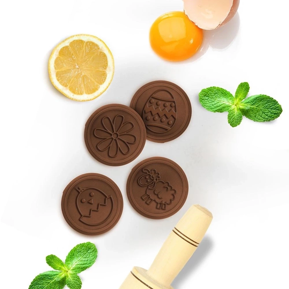 - WIELKANOCNA - W zestawie znajdują się cztery nakładki do pieczątek, które posiadają wielkanocny wzór, dzięki nim stworzysz ciasteczka, pierniczki ze świątecznym motywem. Każda nakładka silikonowa ma inny wyjątkowy wzór. Wzory występujące na nakładkach to: kwiatuszek, baranek, pisanka oraz kurczaczek w jajku.
