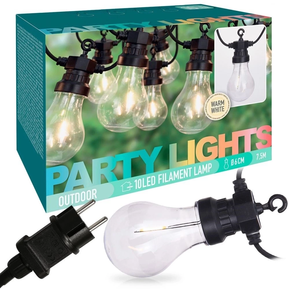 - UNIWERSALNA - Ozdobna girlanda nadaje się do stosowania w pomieszczeniach oraz na zewnątrz w ogrodzie, tarasie, czy na balkonie. Girlanda ozdobna o długości 7,5 metra. Posiada 10 przezroczystych żarówek typu LED o średnicy 6 cm.