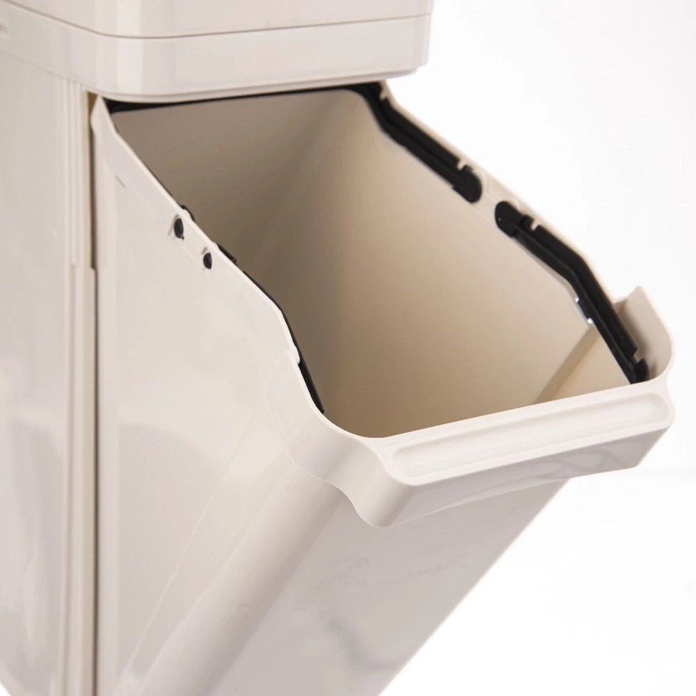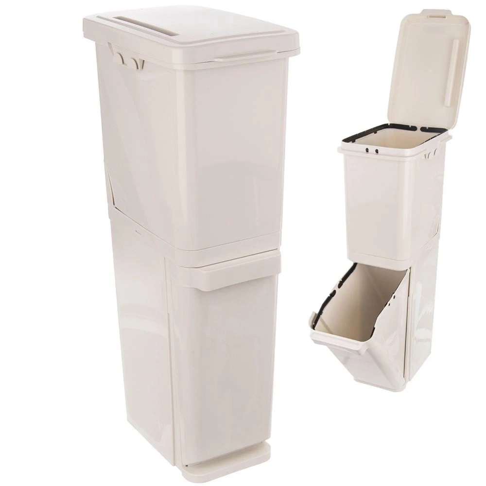 - Praktyczny, zajmujący niewiele miejsce dwupoziomowy kosz do segregacji odpadów. Każdy z koszy posiada pojemność 17,5 litra. Wykonane z wysokiej jakości tworzywa w kolorze beżowym.