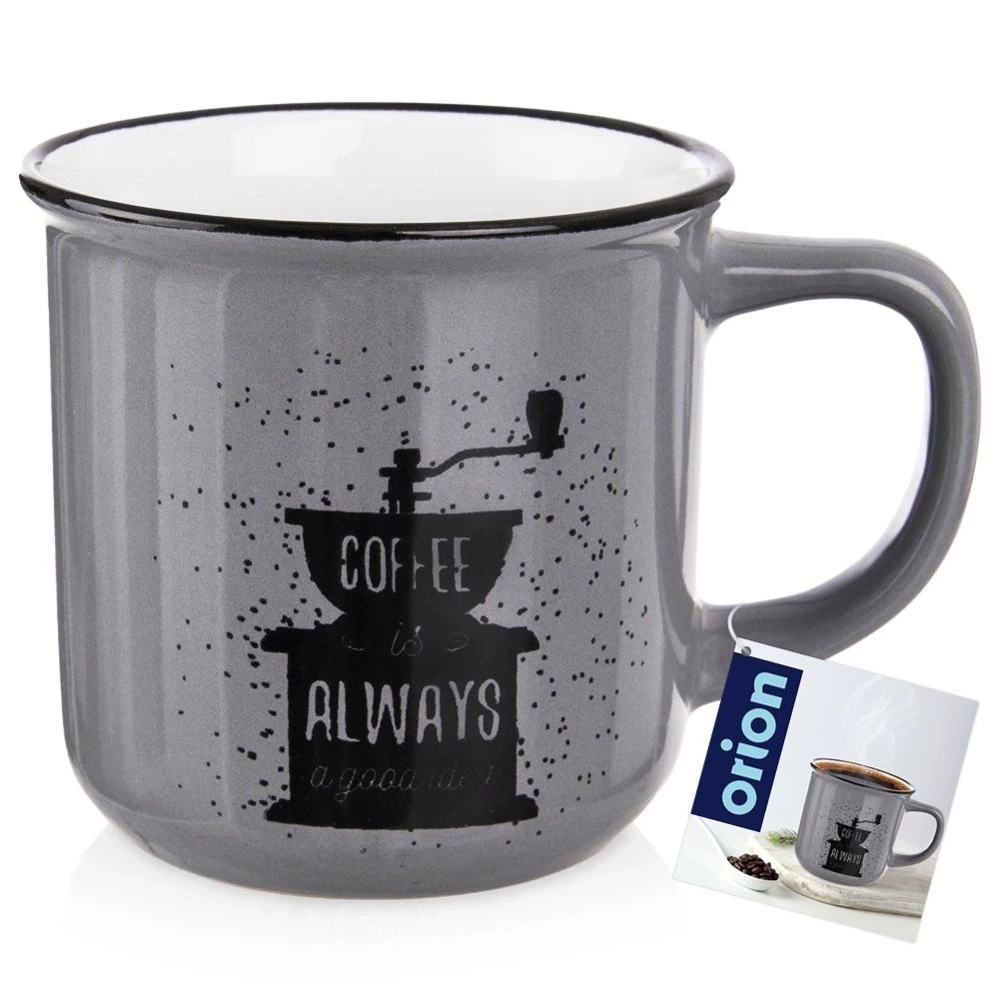 - CERAMICZNY - Kubek wykonany z najwyższej jakości ceramiki w szarym kolorze. Posiada ciekawy, czarny dekor w postaci młynka do kawy z napisem.