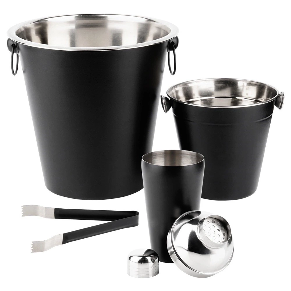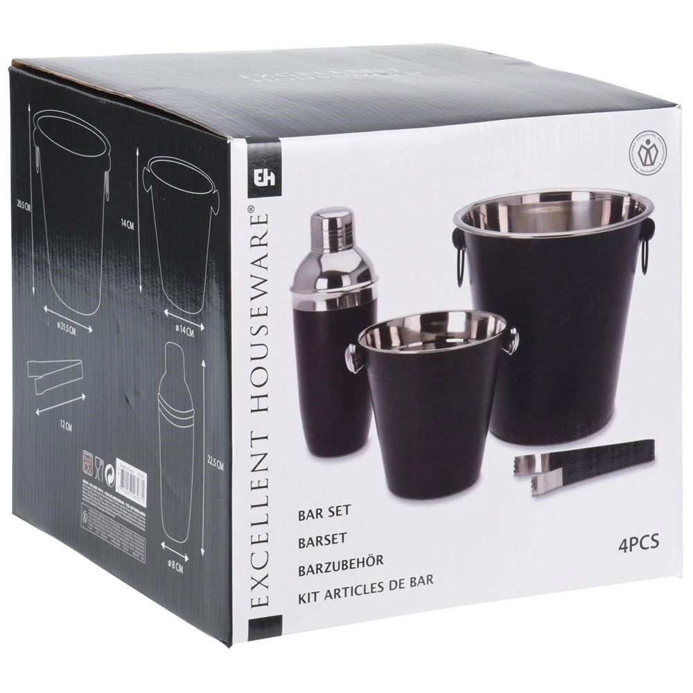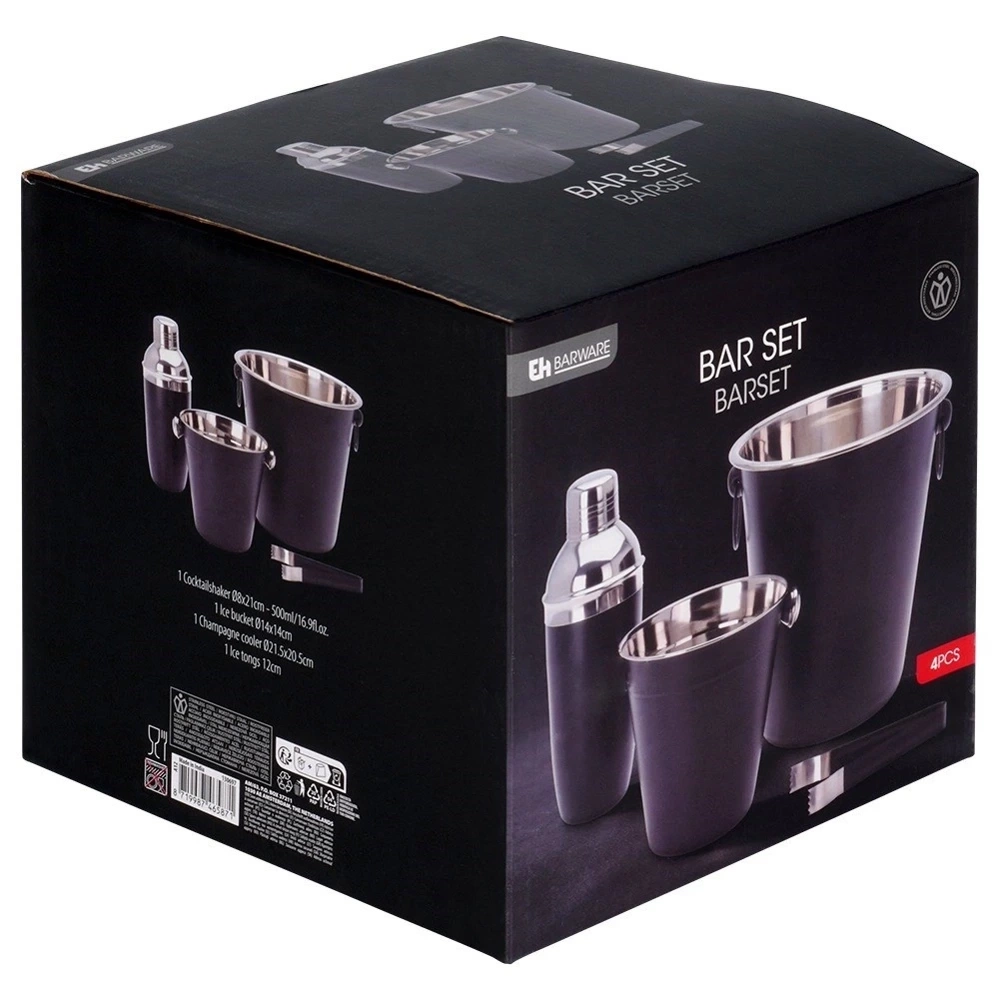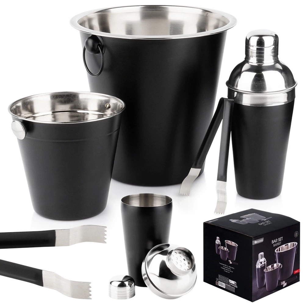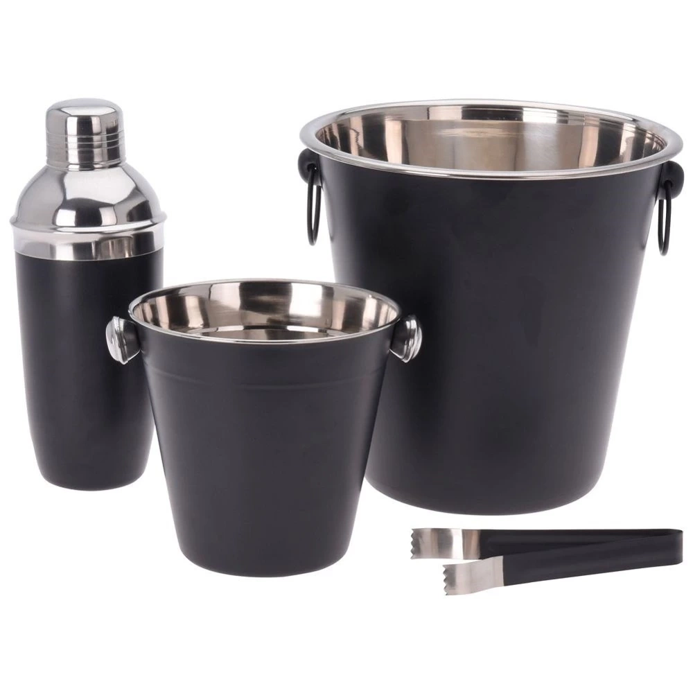 Zestaw barmański zawierający wszystkie potrzebne akcesoria do przygotowania odpowiednich koktajli i drinków. W zestawie: 1x wiaderko małe (średnica 14 cm, wysokość 13 cm), 1x wiaderko duże (średnica 21,5 cm, wysokość 21 cm), 1x shaker (wysokość 21 cm, średnica 8 cm), 1x szczypce (długość 14 cm). Zestaw jest odpowiedni zarówno do użytku domowego jak i profesjonalnym barze. Zestaw ten pozwoli zaskoczyć gości wyjątkowymi koktajlami i drinkami. Wyprodukowano zgodnie z europejskimi standardami.