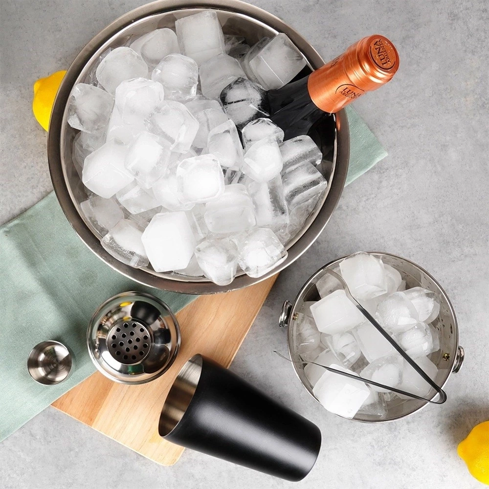 - PRZYDATNY - Zestaw barmański składający się z 4-elementów. Idealny do przygotowania koktajli i drinków, a także serwowania alkoholi. W zestawie: wiaderko małe na lód, wiaderko duże na butelkę, shaker oraz szczypce do lodu.