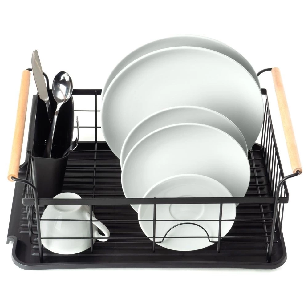- Elegancka suszarka do naczyń w kolorze czarnym. Posiada miejsce na talerze, szklanki oraz sztućce. Wyposażona w tacę ociekową.