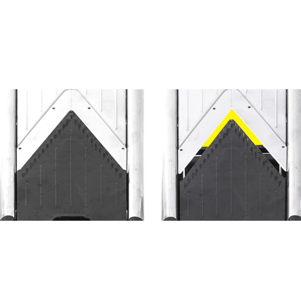 - WYGODNE UŻYTKOWANIE - W zestawie uchwyt do warzyw i owoców, który umożliwia prace bez ryzyka zranienia. Szatkownica jest wyposażona w składane, antypoślizgowe nóżki, które zapewniają odpowiednie i stabilne nachylenie. Dodatkowo, posiada pojemnik do przechowywania ostrzy, co pomaga utrzymać porządek i zapobiega przypadkowym uszkodzeniom.