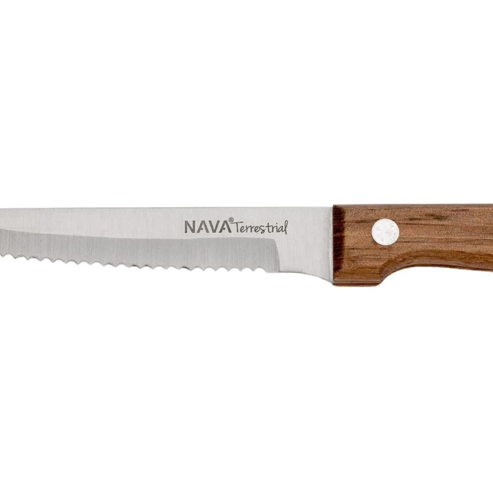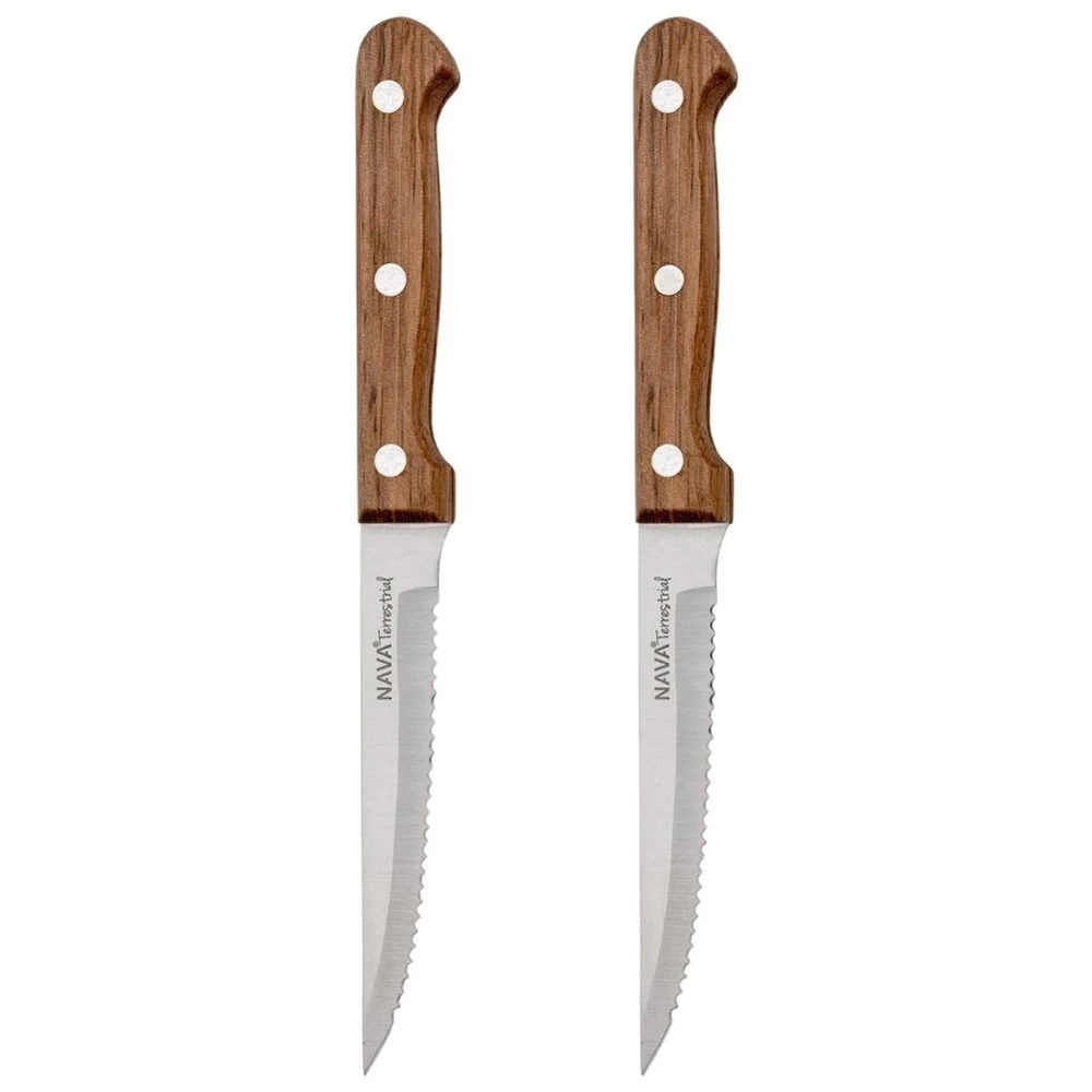 Komplet dwóch noży kuchennych z ząbkami. Solidnie wykonane z wytrzymałych materiałów. Noże są niezwykle wygodne w użytkowaniu, dzięki odpowiednio wyprofilowanej rączce. Przydatne podczas grillowania, ale również do użytku domowego. Noże nadają się do mycia w zmywarce do naczyń, zaleca się jednak mycie ręczne, a następnie wytarcie do sucha noża po umyciu lub wyjęciu ze zmywarki. Ciekawy, a zarazem klasyczny wygląd sprawia, że noże wpasuje się do każdej kuchni. Oryginalny produkt greckiej marki NAVA z linii przyborów kuchennych Terrestrial. Wyprodukowano zgodnie z europejskimi standardami.