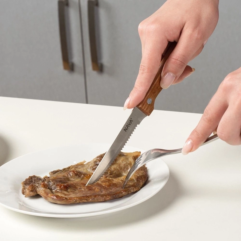 - Noże z ostrzem ze stali nierdzewnej oraz nitowanym drewnianym uchwytem. Szczególnie polecane do spożywania pizzy oraz steków.