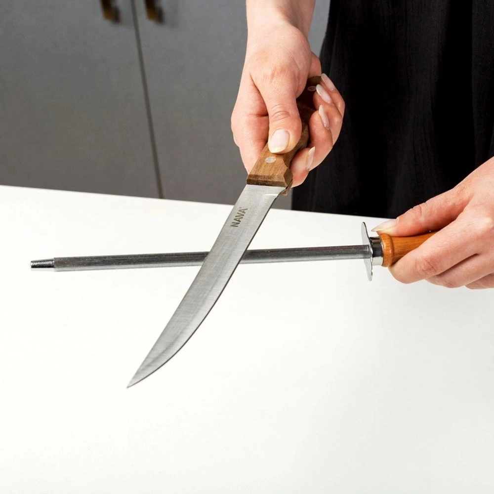 Tradycyjna ostrzałka do stalowych noży. Odpowiednia dla noży bez ząbkowanych i ceramicznych ostrzy. Z jej pomocą możemy naostrzyć każdy nóż w sytuacji, gdy już się stępił. Posiada wygodną rączkę, która zapewni wygodne użytkowanie. Oryginalny produkt greckiej marki NAVA z linii przyborów kuchennych Terrestrial. Wyprodukowano zgodnie z europejskimi standardami.