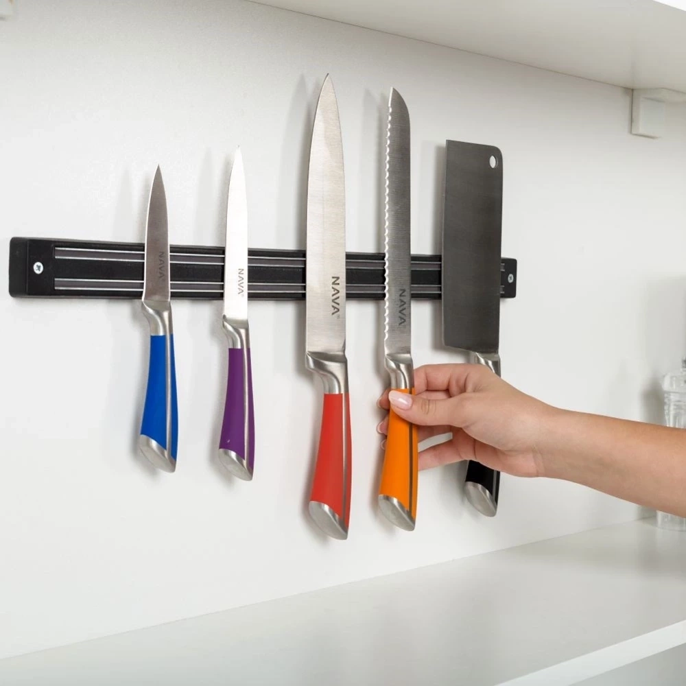Listwa magnetyczna do przechowywania noży. Dzięki niej możemy wygodnie przechowywać noże i przybory kuchenne, oszczędzając przestrzeń w kuchni. Taka listwa sprawdzi się z powodzeniem do przechowywania różnych typów noży, takich jak stalowe, ceramiczne i metalowe. Listwę można wykorzystać również w warsztacie, domku gospodarczym czy altanie ogrodniczej, np. do układania śrubokrętów i innych metalowych narzędzi. Zamontowanie listwy na odpowiedniej wysokości zapewni bezpieczeństwo i przechowywanie noży poza zasięgiem dzieci. Oryginalny produkt greckiej marki NAVA z linii przyborów kuchennych Misty. Wyprodukowano zgodnie z europejskimi standardami.
