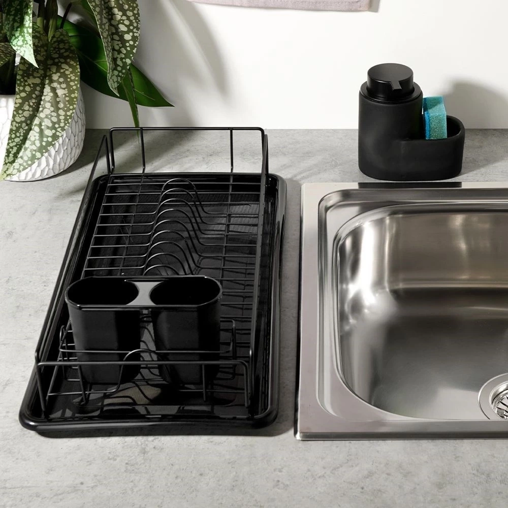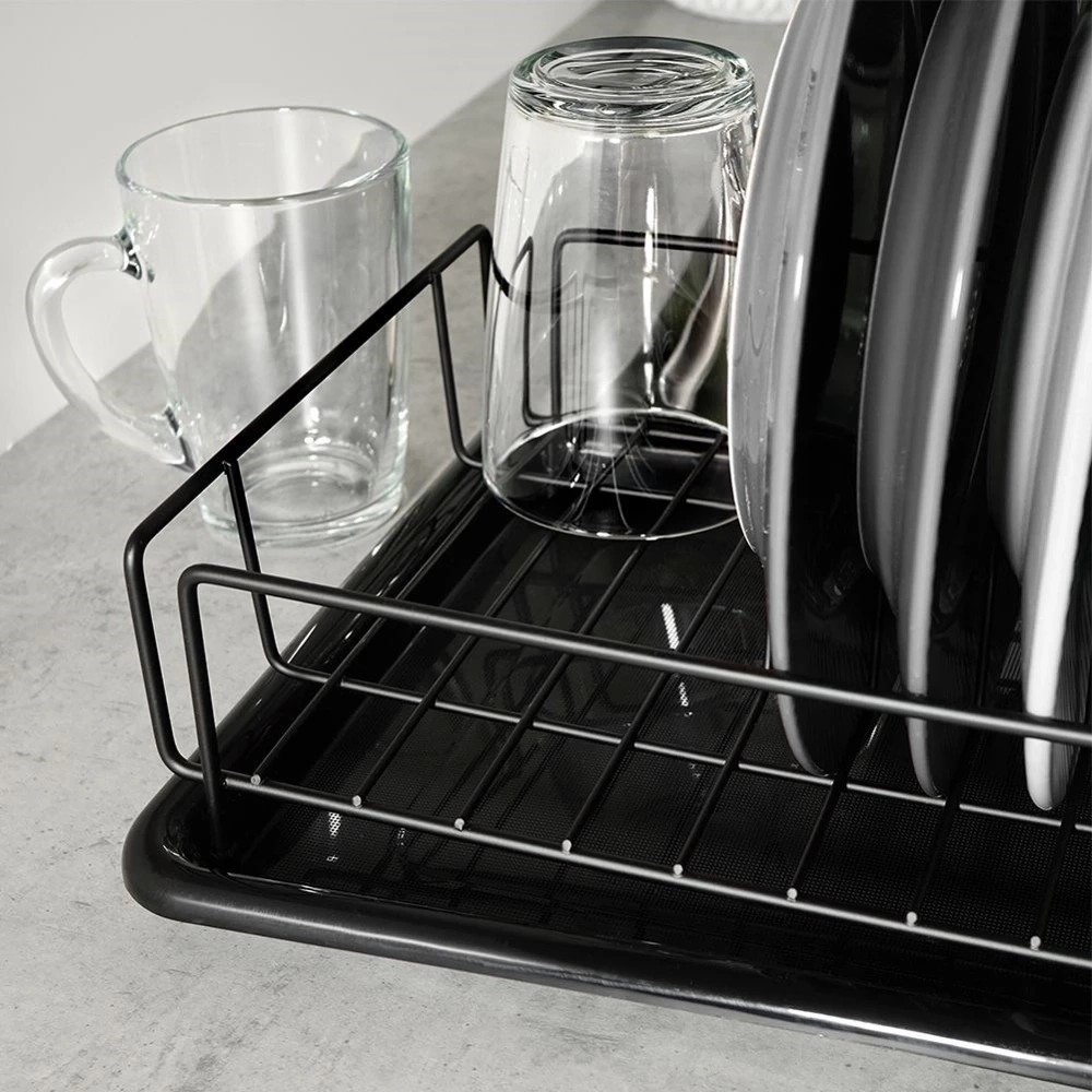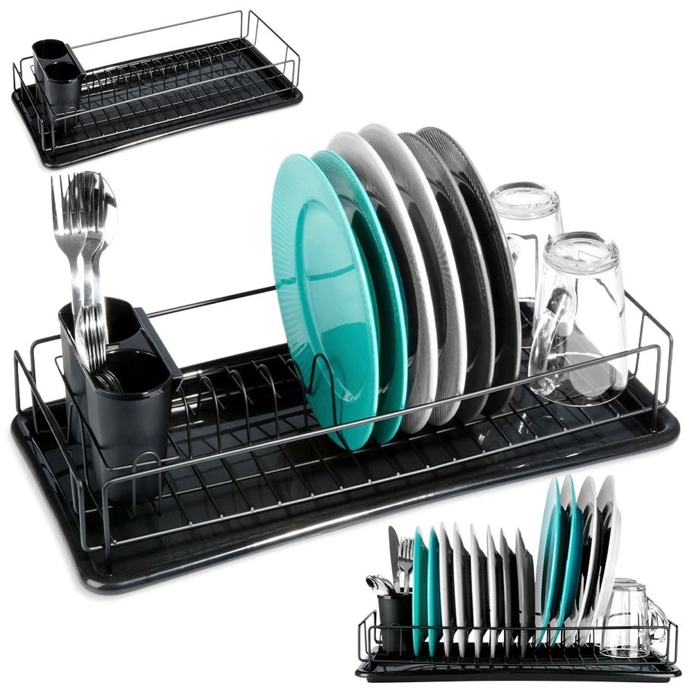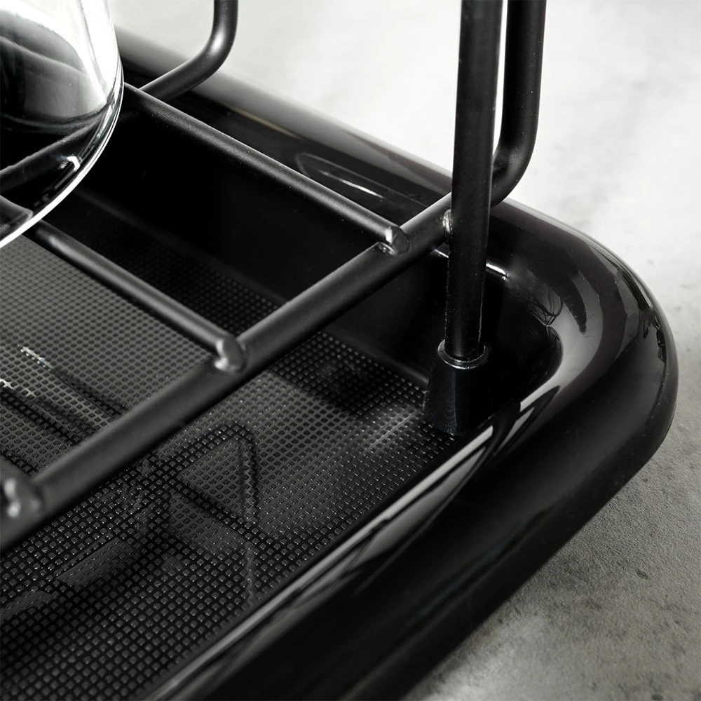 - Stylowa suszarka do naczyń w kolorze czarnym. Posiada miejsce na talerze, szklanki oraz sztućce. Wykonana z Wyposażona w tacę ociekową.