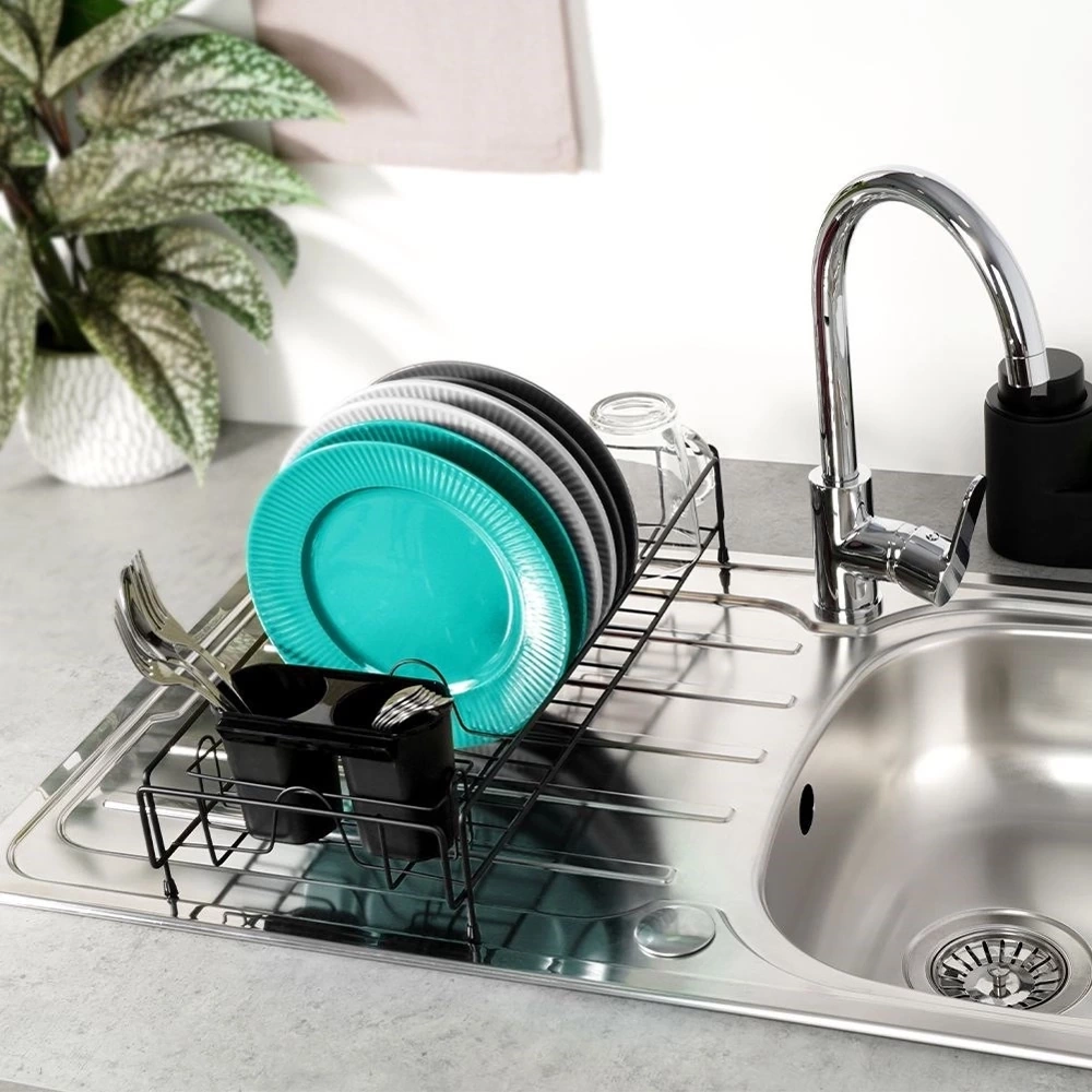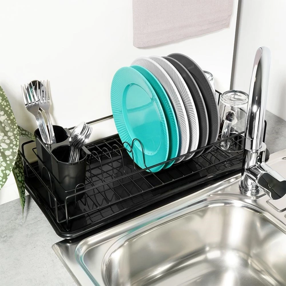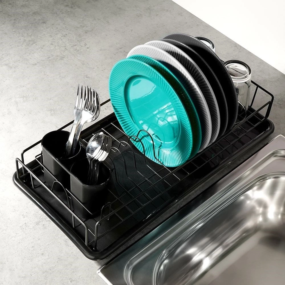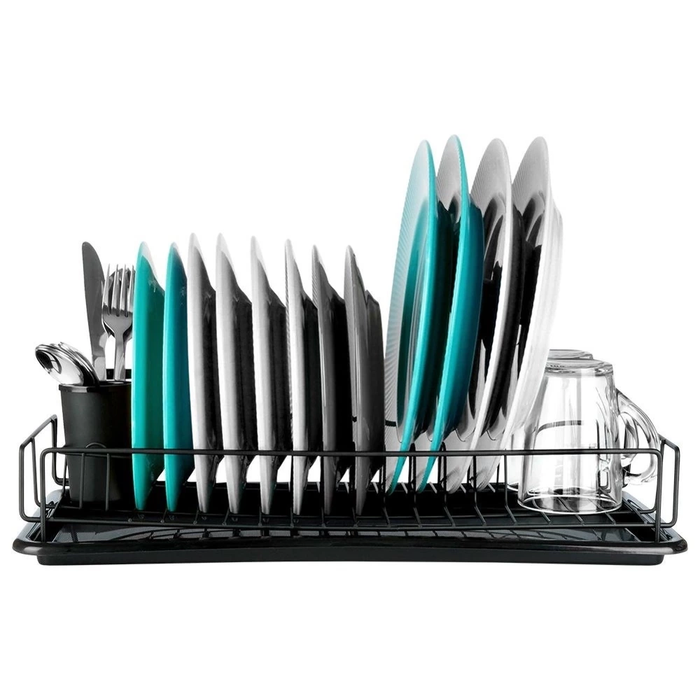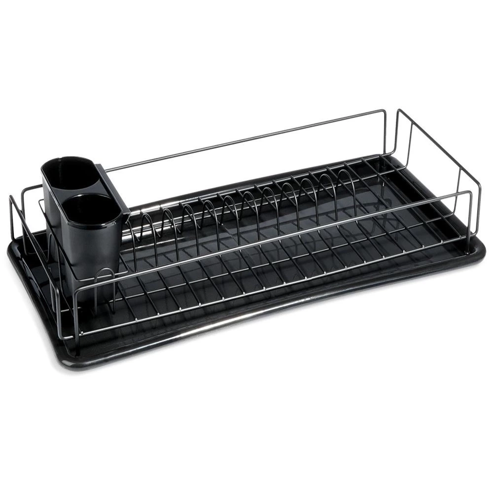 - Stylowa suszarka do naczyń w kolorze czarnym. Posiada miejsce na talerze, szklanki oraz sztućce. Wykonana z Wyposażona w tacę ociekową.