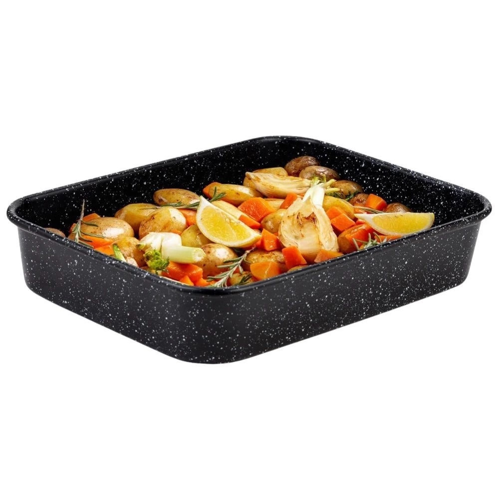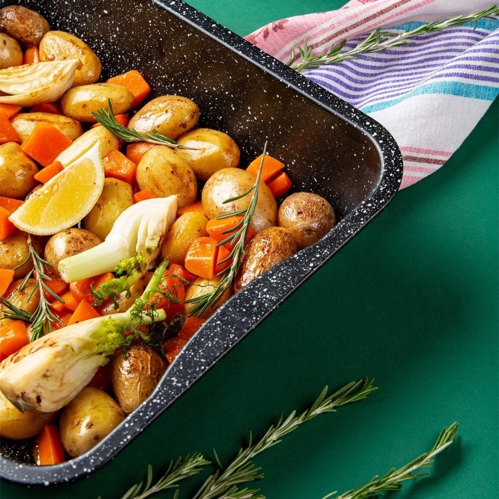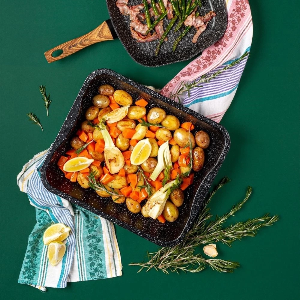- Brytfanka z nieprzywierającą powłoką granitową do pieczenia mięs i ciast w piekarniku. Nadaje się do użytku w piekarnikach gazowych oraz elektrycznych.