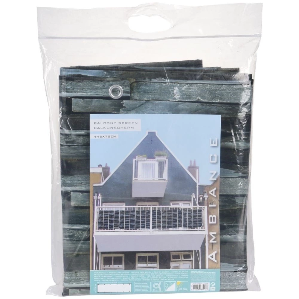 Wodoodporna mata na balustrady balkonowe i tarasowe o wymiarach 445 x 75 cm. Osłoni przed warunkami atmosferycznymi i zapewni prywatność podczas spędzania czasu na tarasie lub balkonie. Mata wykonana jest z odpornego materiału. Oryginalny produkt holenderskiej marki Ambiance. Wyprodukowano zgodnie z europejskimi standardami.