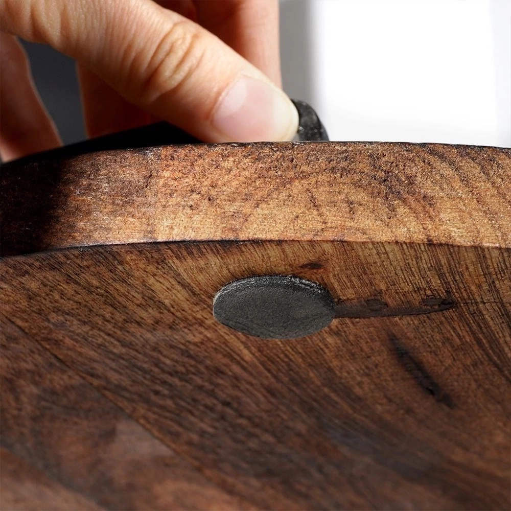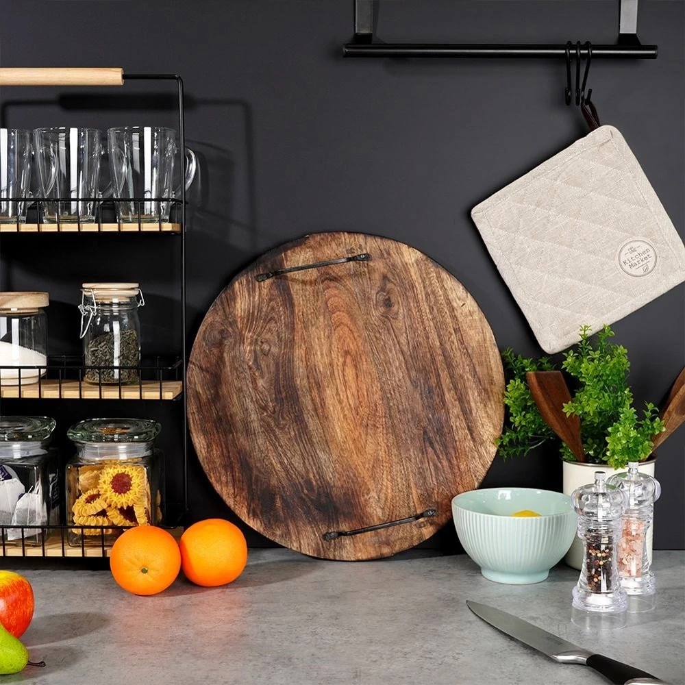 - DREWNIANA - Wytrzymała i solidna deska wykonana metodą rzemieślniczą z egzotycznego drewna mangowca. Okrągła deska do krojenia i serwowania wykonana jest z naturalnych materiałów, więc jej średnica może różnić się w zależności od deski od 39 do 40 cm. Grubość deski wynosi 2 cm.