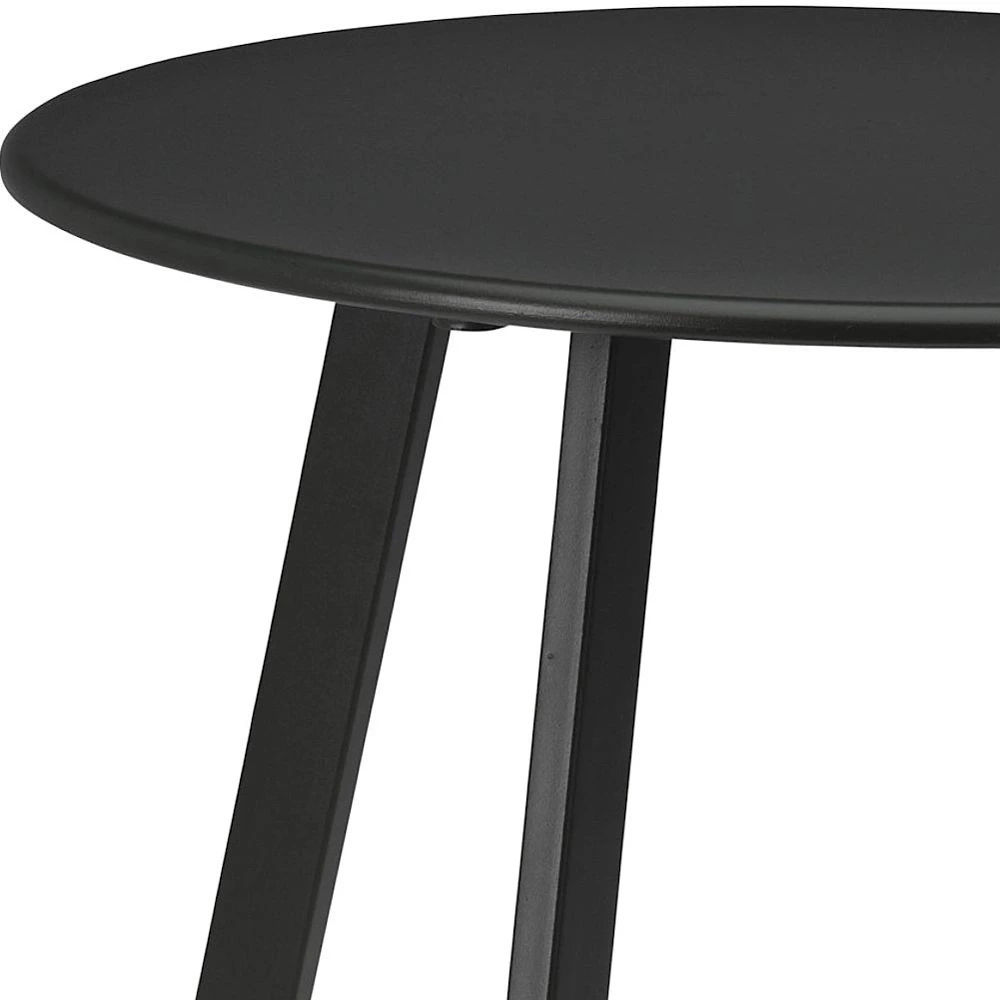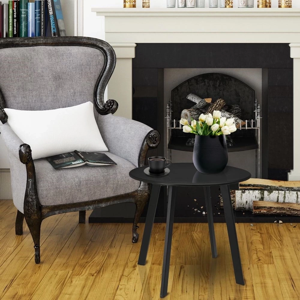 - Okrągły stolik balkonowy wykonany z metalu w ciemnym szarym kolorze. Świetnie sprawdzi się na balkon, taras, do ogrodu, ale również do salonu.