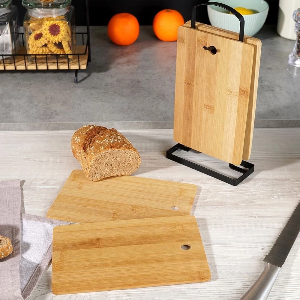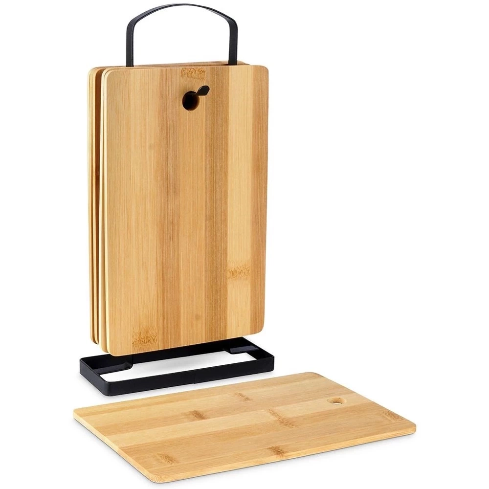 - Zestaw sześciu bambusowych desek śniadaniowych na stojaku. Deski sprawdzą się zarówno do krojenia jak i serwowania śniadań czy przystawek.