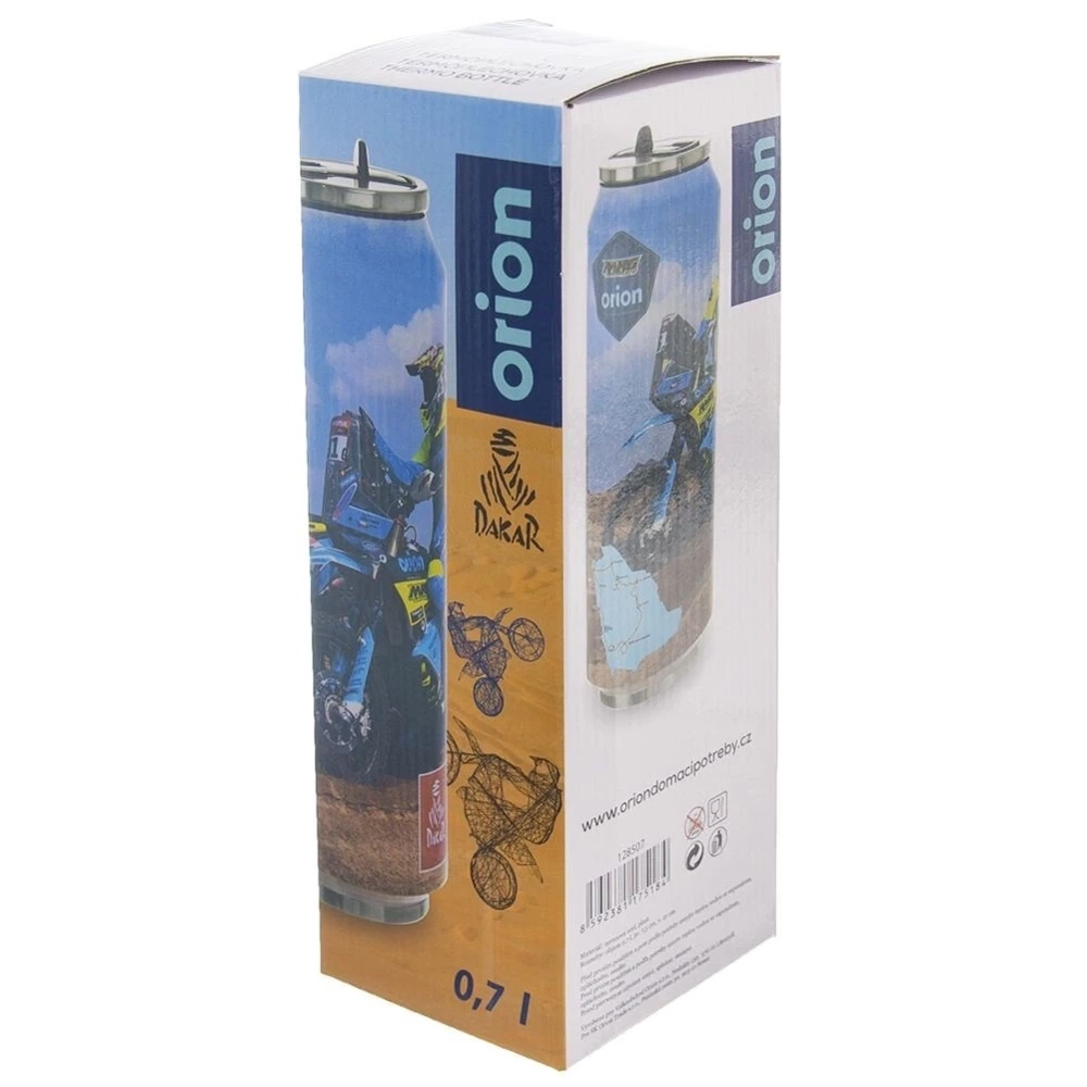 Kubek termiczny w kształcie puszki. Posiada efektowny motyw rajdu Dakar. Wyposażony w ustnik, który umożliwi picie z termosu bez konieczności przechylania go. Idealny do picia napojów ciepłych oraz zimnych. Dzięki termicznym właściwościom pozwoli na utrzymanie ciepła lub zimna wlanego napoju. Sugerowane napełnienie kubka do maksymalnie 90% pojemności, w celu spełnienia funkcji podtrzymania temperatury. Przed napełnieniem termosu właściwym napojem najlepiej wlać gorącą lub zimną wodę (w zależności od potrzeby) pozostawić na 5 minut i wylać, dzięki temu zabiegowi temperatura dłużej zostanie podtrzymywana. Idealny pomysł na prezent. Sprawdzi się podczas podróży, wycieczek, ale również podczas codziennego użytkowania. Oryginalny produkt czeskiej marki Orion. Wyprodukowano zgodnie z europejskimi standardami.