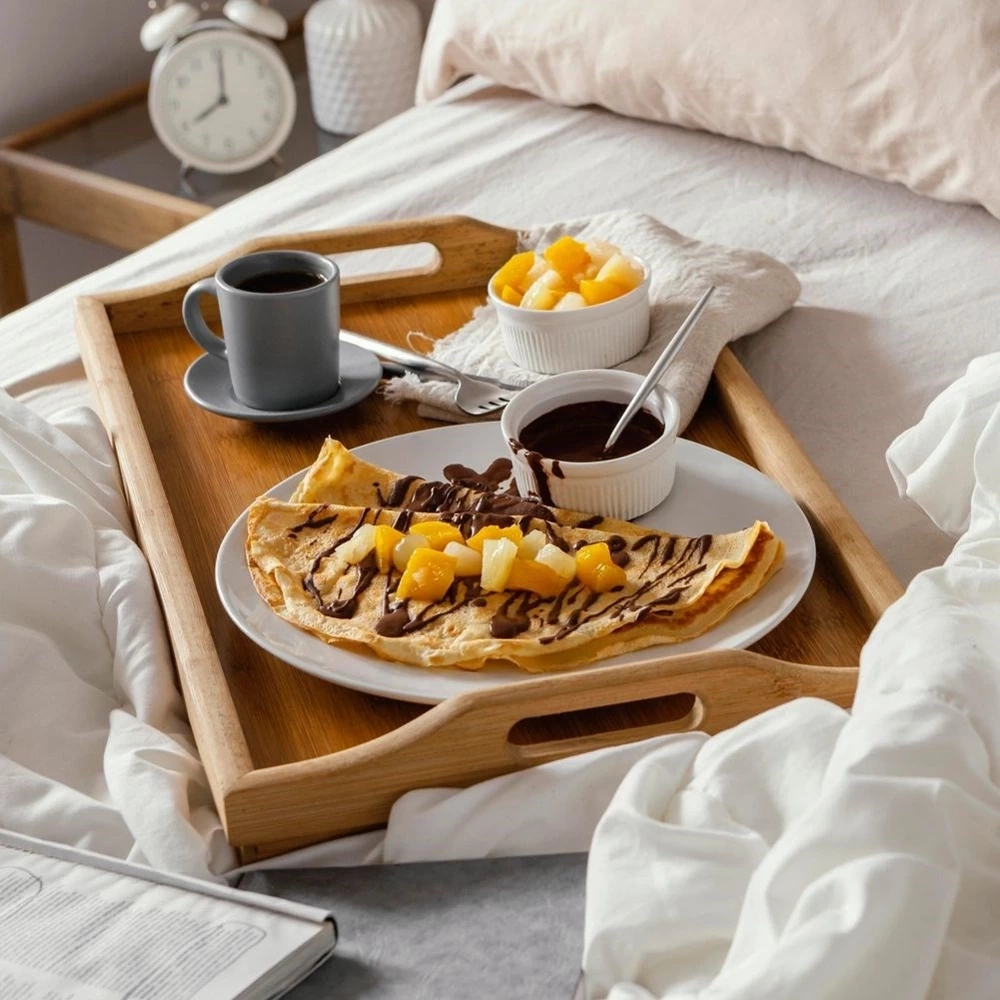 - Składany stolik śniadaniowy wykonany z drewna bambusowego. Idealnie sprawdzi się podczas podawania śniadania do łóżka, jako podstawka pod laptop, a także taca do serwowania dań.