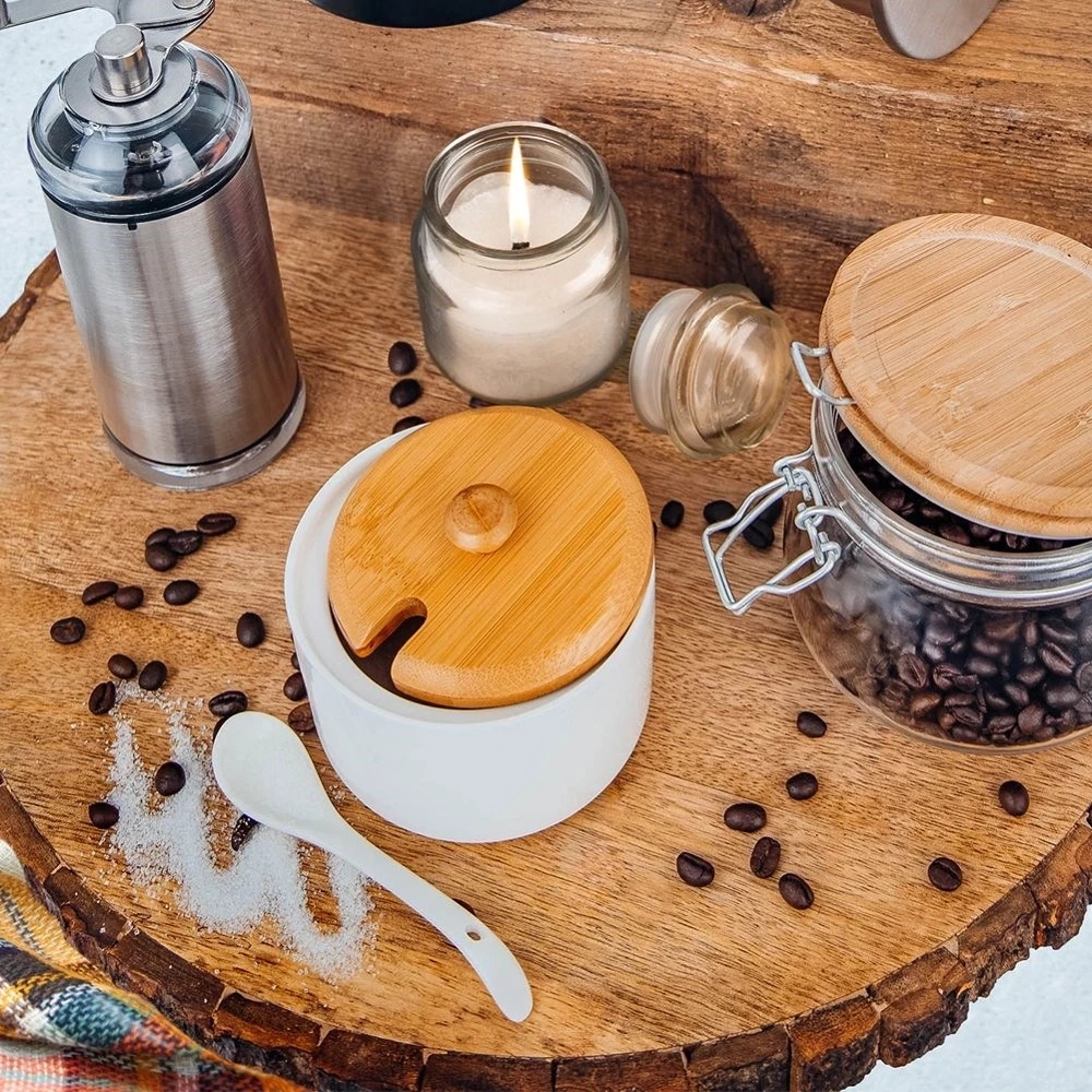 - Cukierniczka do przechowywania i serwowania cukru. Wykonana z białej porcelany oraz drewna bambusowego. Będzie stanowić piękną dekorację stołu oraz kuchni.