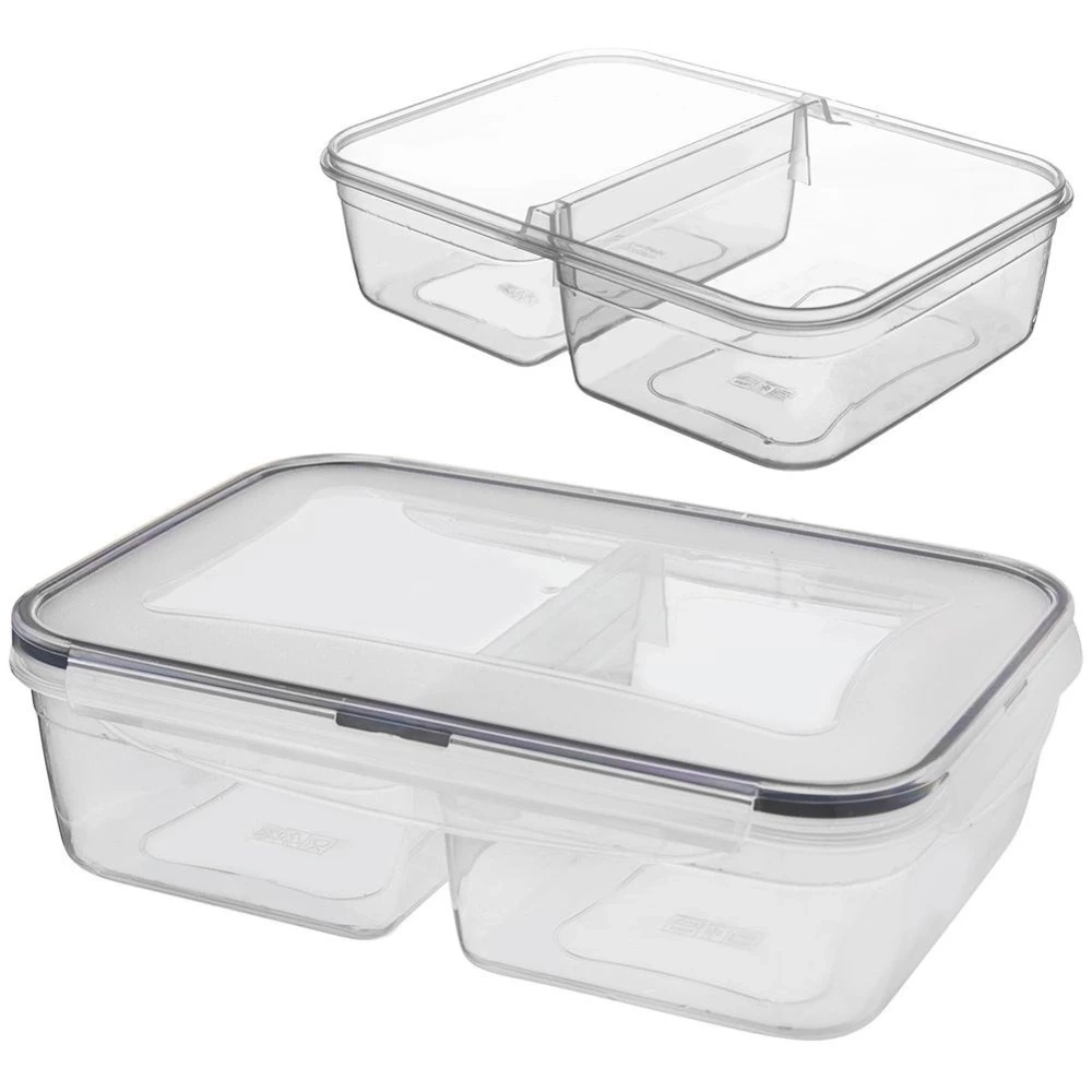 - Pojemnik na żywność, podzielony na dwie części, wyposażony w uszczelkę oraz zatrzaski do zamknięcia. Idealny do pracy, szkoły na piknik. Świetnie sprawdzi się jako lunchbox.
