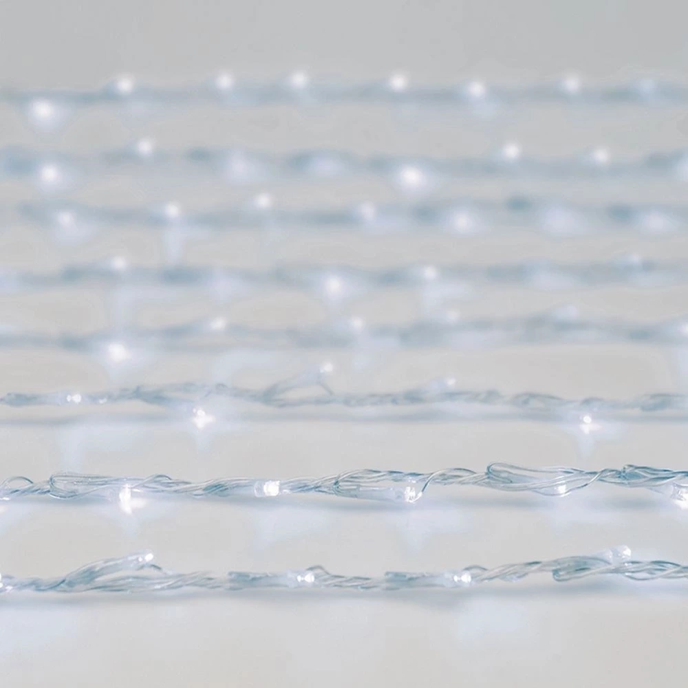 - OŚWIETLENIE LED - Posiada diody LED o zimnej, białej barwie - 220 sztuk. Kurtyna składa się z 11 sznurów, na każdym znajduje się 20 lampek LED, a odległość między sznurami wynosi 20 cm. Zasilane sieciowo, odległość kabla do pierwszej lampki wynosi 5 metrów.