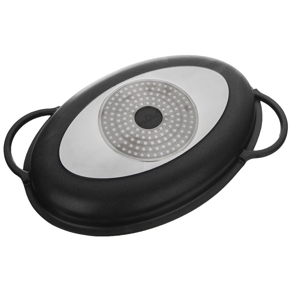 - PRAKTYCZNA - Patelnia do grillowania o wymiarach całkowitych 43 x 28 x 10 cm z pokrywką. Wymiary wewnętrzne patelni to 38 x 25 x 5 cm. Naczynie sprawdzi się jako patelnia z grillowanym dnem lub brytfanka do pieczenia w piekarniku. Pokrywa wyposażona w dozownik przez który możemy dozować przyprawy płynne lub wino.
