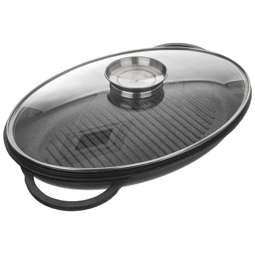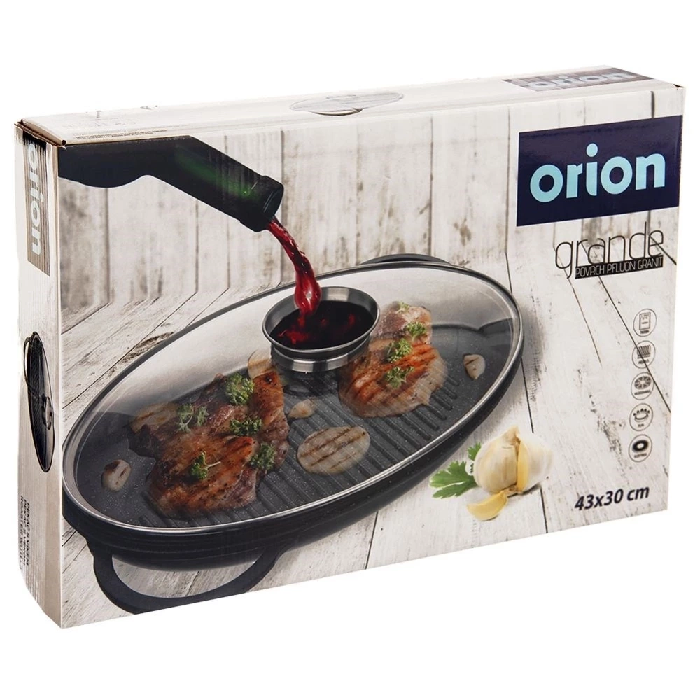Patelnia grillowa z pokrywką posiadającą dozownik na płynne przyprawy. Wykonana z wytrzymałych materiałów. Łatwa w czyszczeniu i użytkowaniu - potrawy nie przywierają. Posiada grillowane dno za pomocą którego przygotujemy mięsa, ryby oraz warzywa. Idealnie sprawdzi się do duszenia, pieczenia oraz gotowania potraw. Możliwość stosowania na kuchence oraz w piekarniku. W naszej ofercie również inne naczynia z serii GRANDE. Oryginalny produkt czeskiej marki Orion. Wyprodukowano zgodnie z europejskimi standardami.