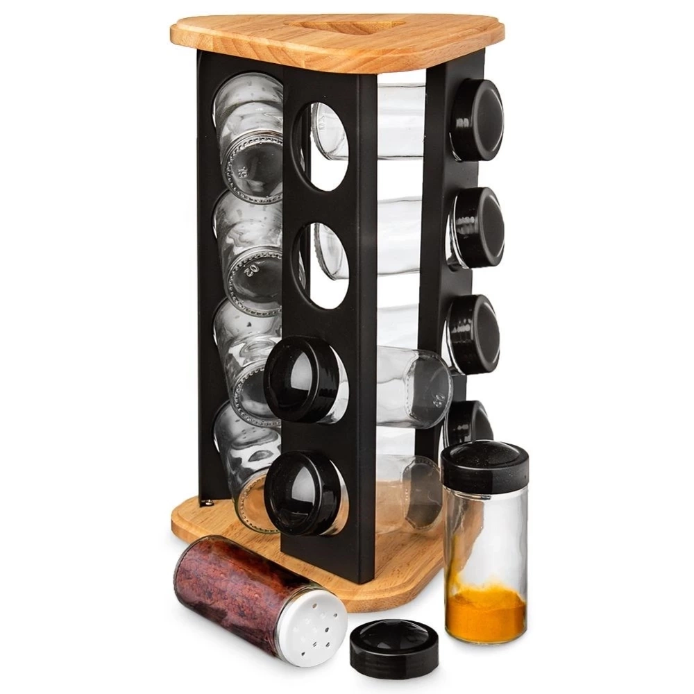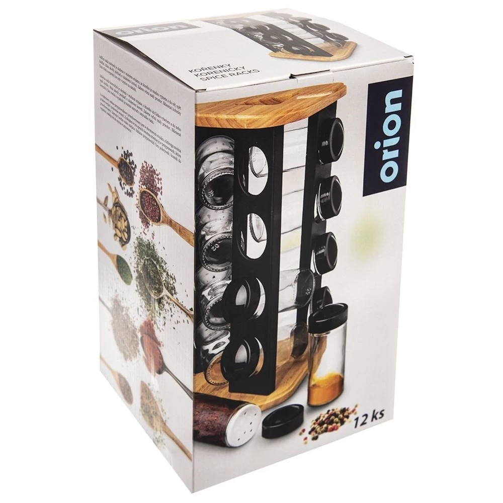 - Obrotowy stojak na przyprawy wraz z 12 pojemnikami. Każdy pojemnik posiada zakrętkę oraz przesiewacz. Z jego pomocą wyeksponujesz przyprawy w domu.