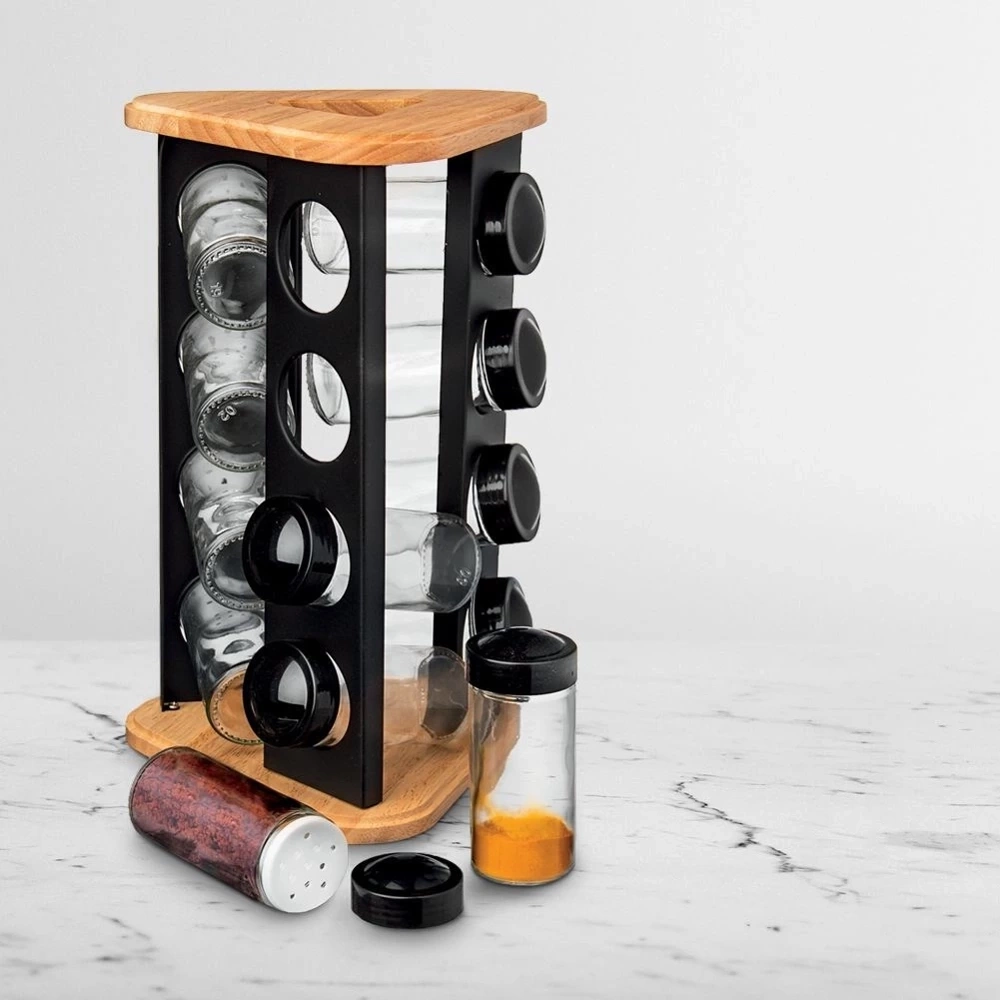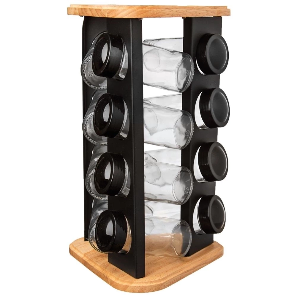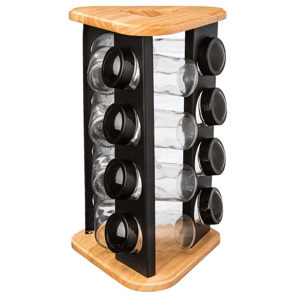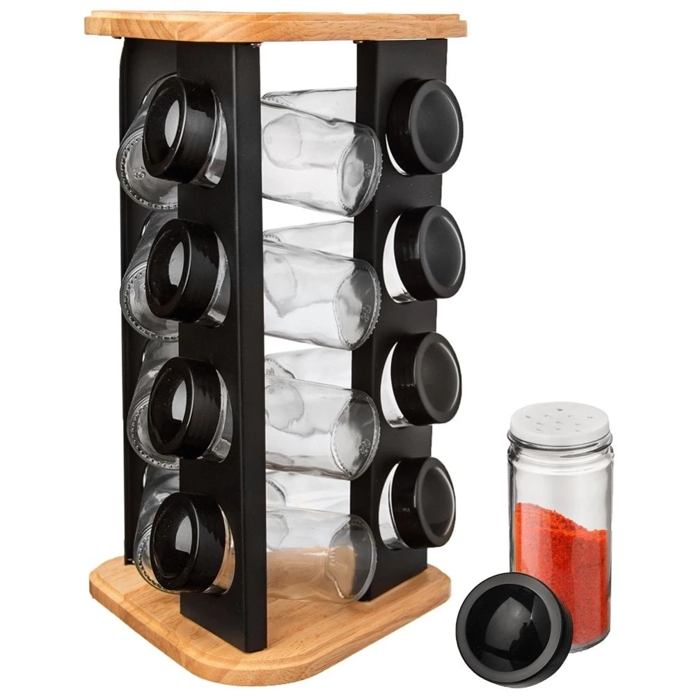 - PRAKTYCZNY - Stojak na przyprawy wraz z 12 pojemnikami. Stojak ma wymiary: 18 x 18 x 29,5 cm. Pojemniki mają pojemność 80 ml i wymiary: 4,5 x 4,5 x 10 cm.
