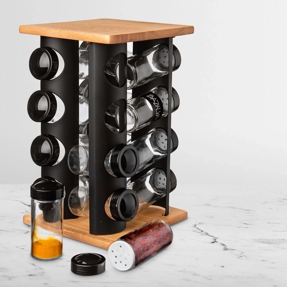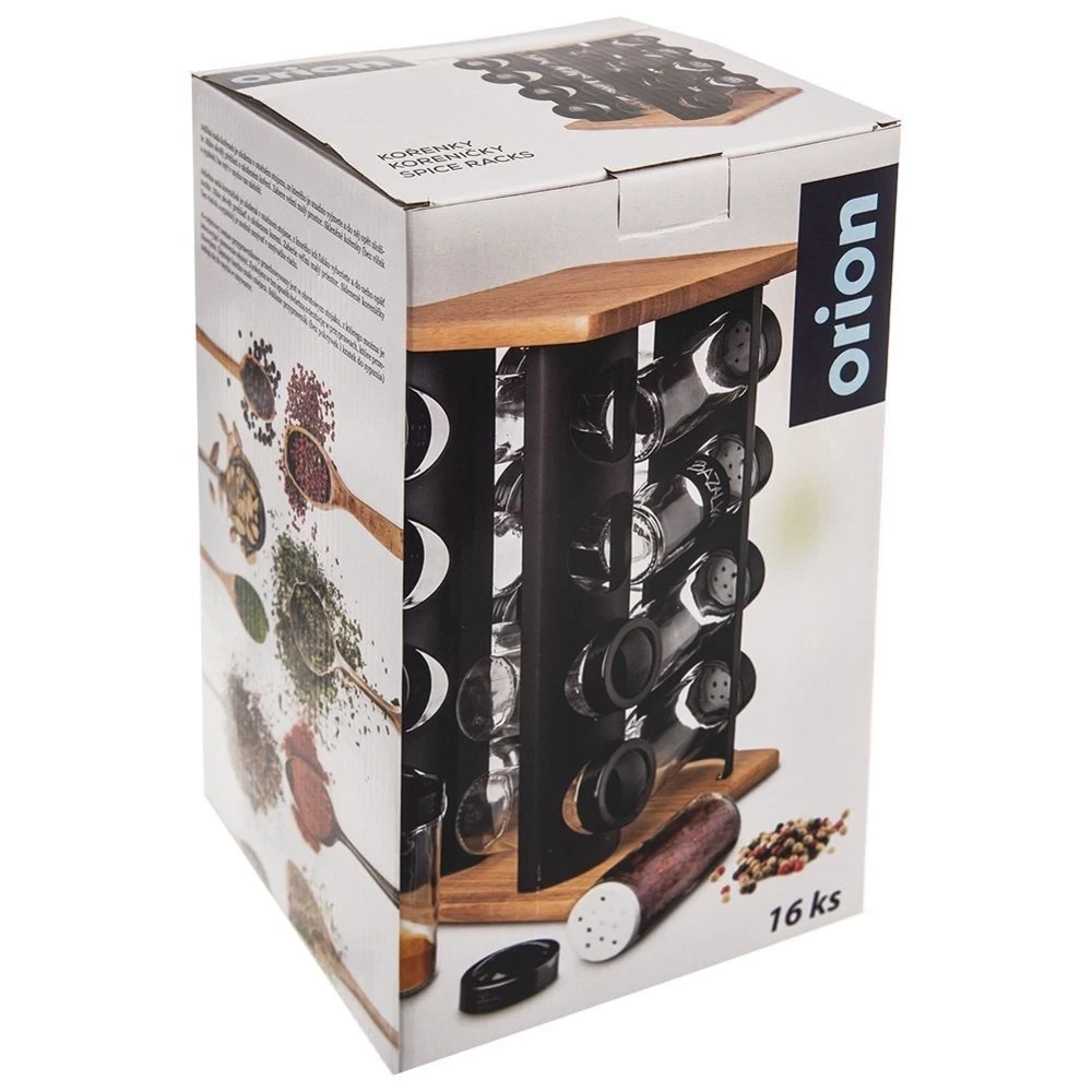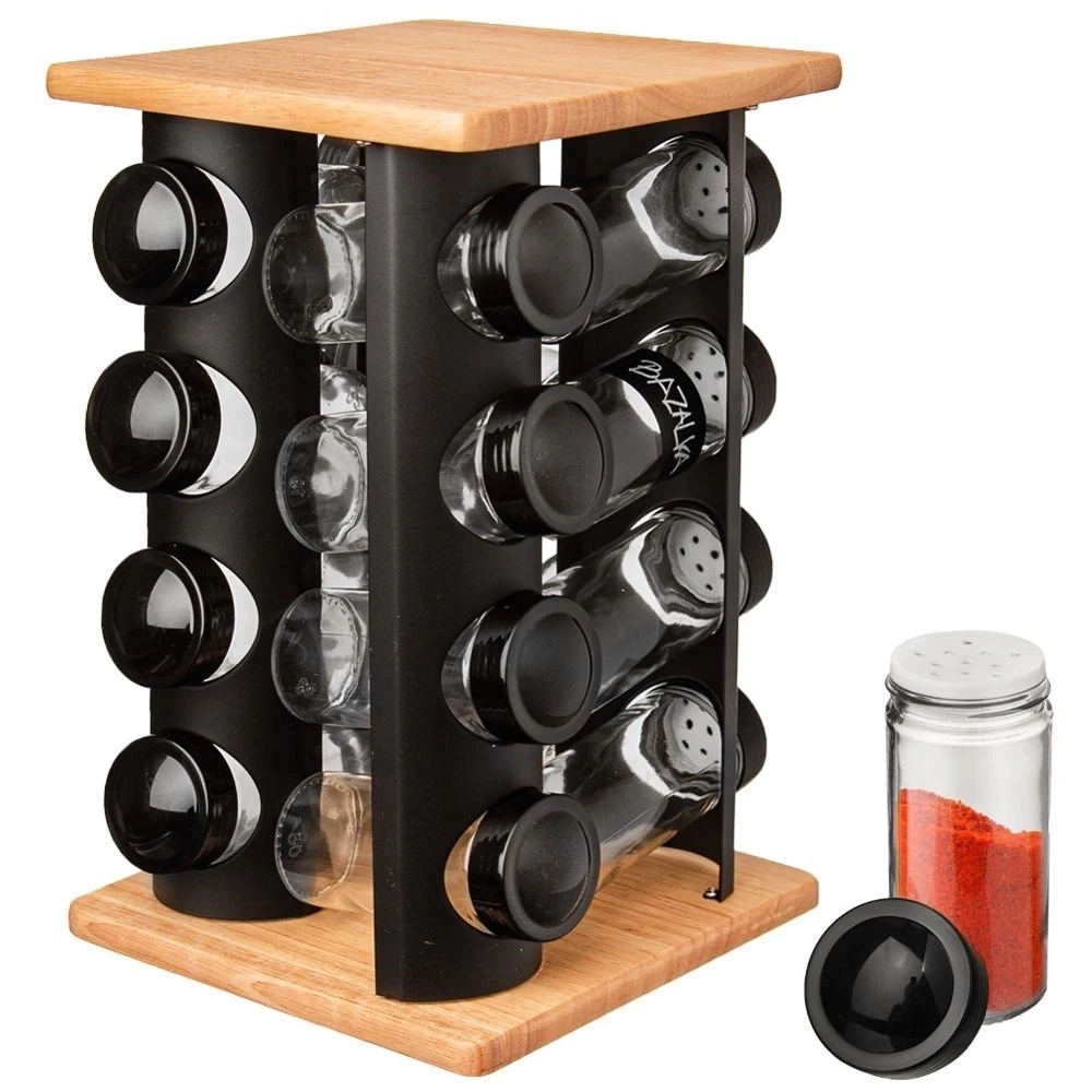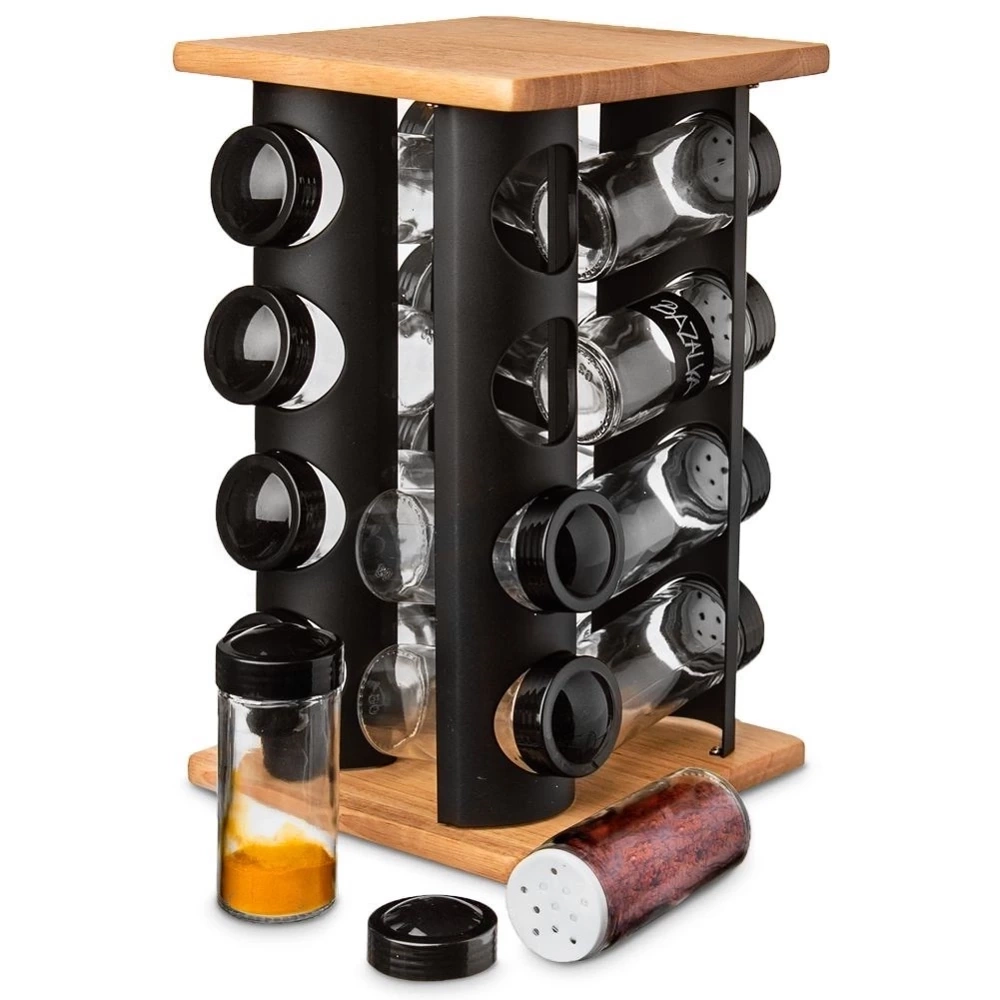 - Obrotowy stojak na przyprawy wraz z 16 pojemnikami. Każdy pojemnik posiada zakrętkę oraz przesiewacz. Z jego pomocą wyeksponujesz przyprawy w domu.
