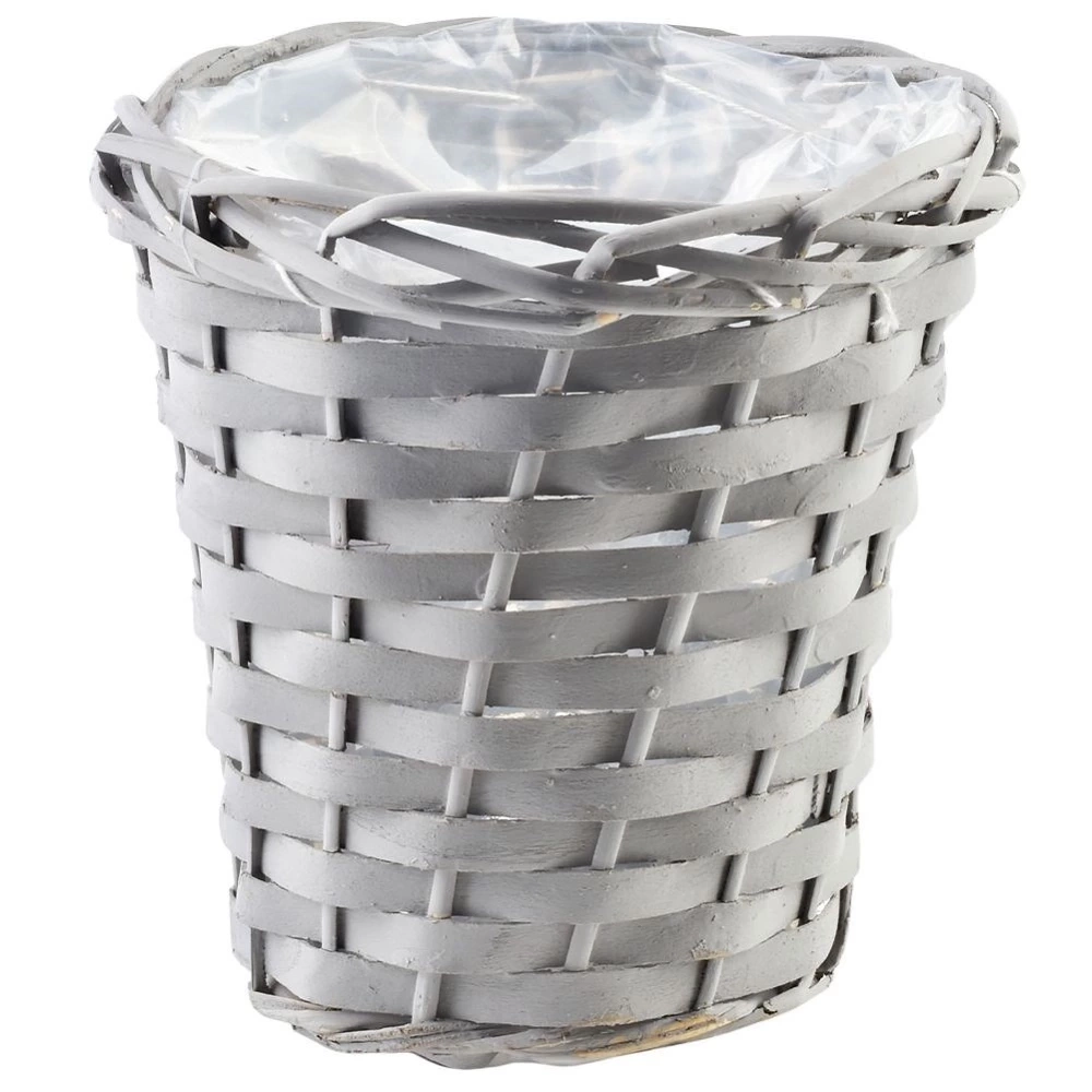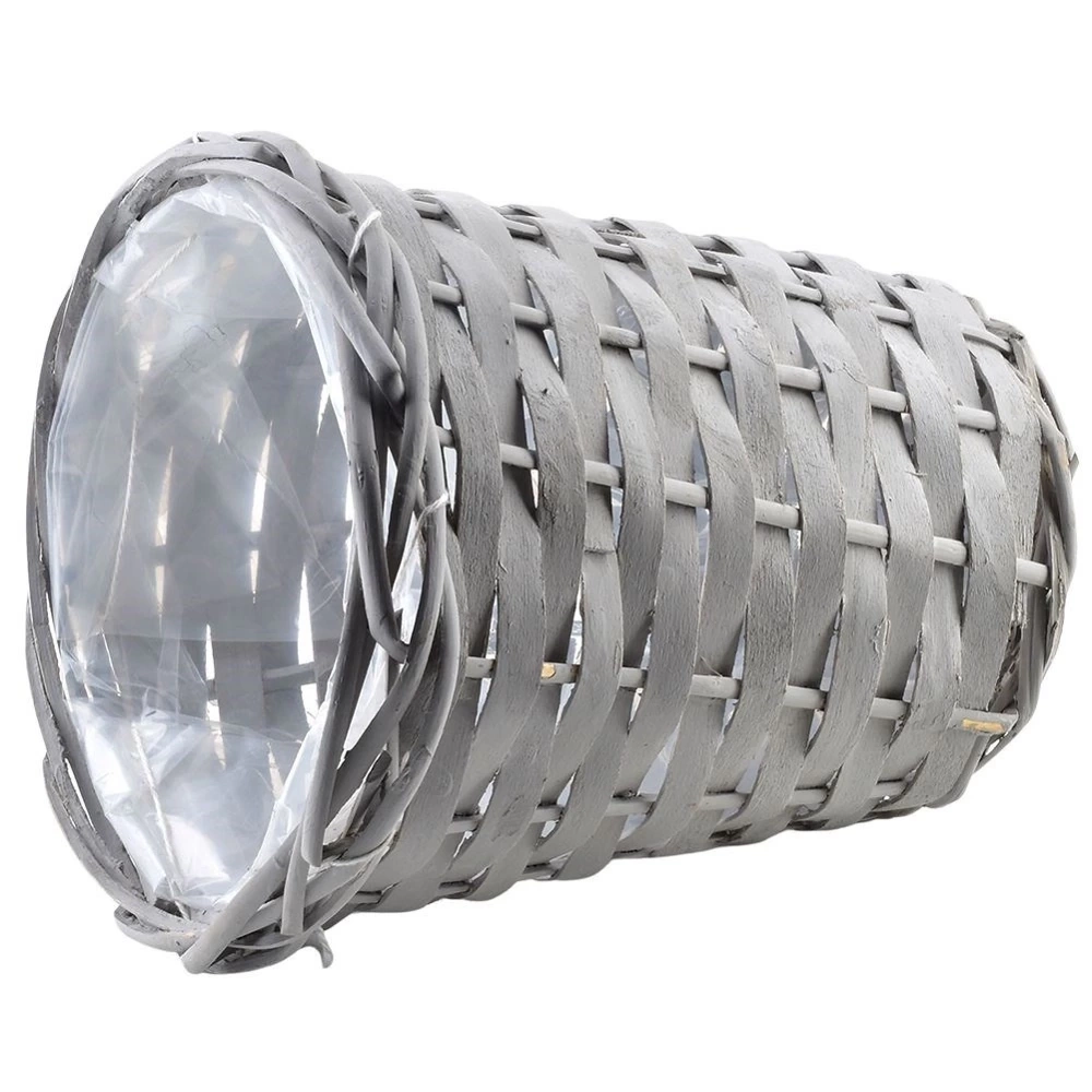 - Osłonka na doniczkę w formie plecionego koszyka. Idealna na kwiaty oraz rośliny. Wykonana z wikliny w kolorze szarym. Zabezpieczona folią od środka.