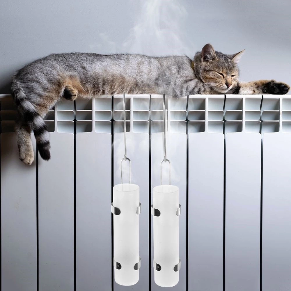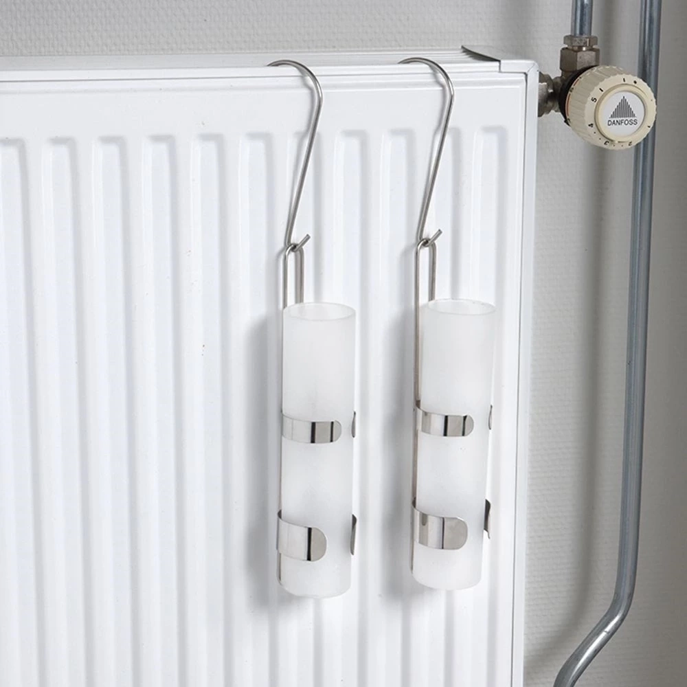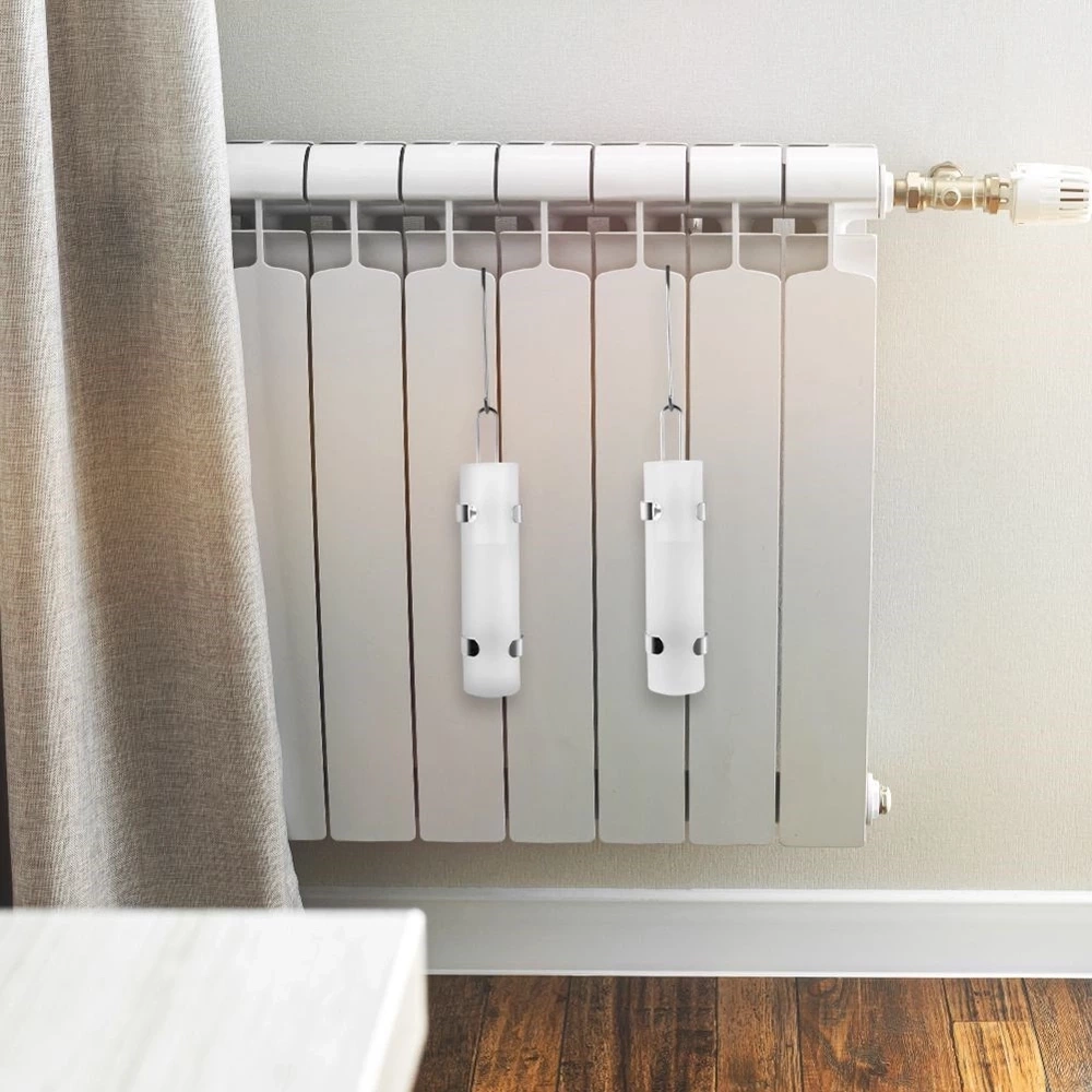 - PRZYDATNE - Zestaw dwóch nawilżaczy powietrza zawieszanych na kaloryfer. Każdy nawilżacz ma wymiary: 6 x 5 x 25 cm i pojemność 325 ml.