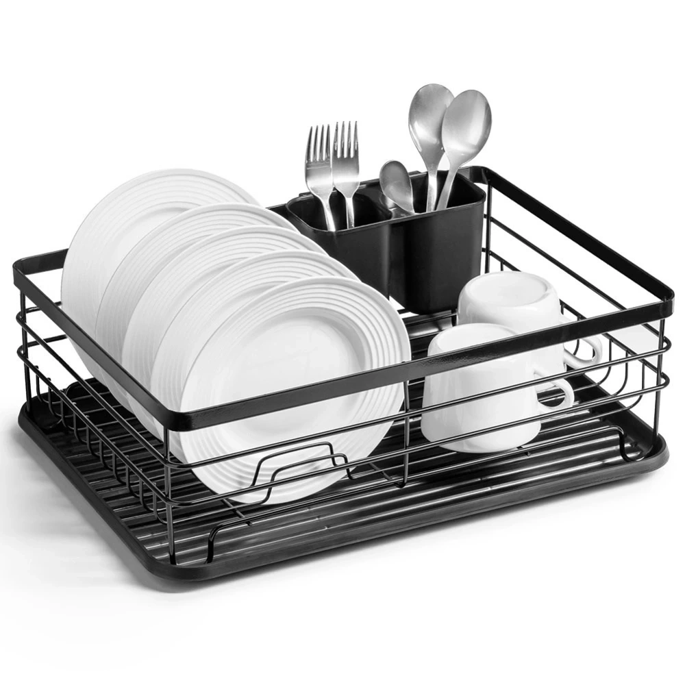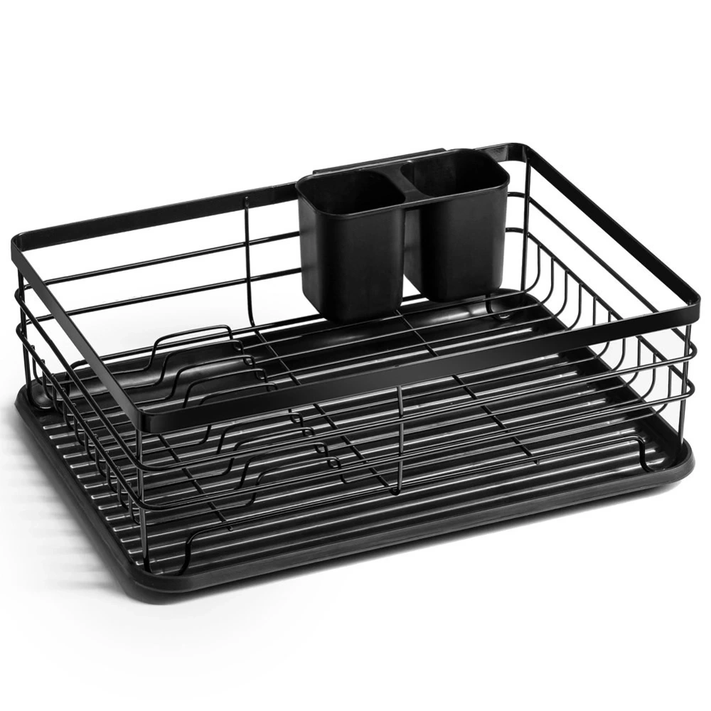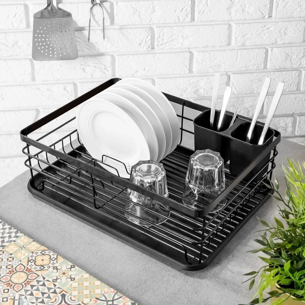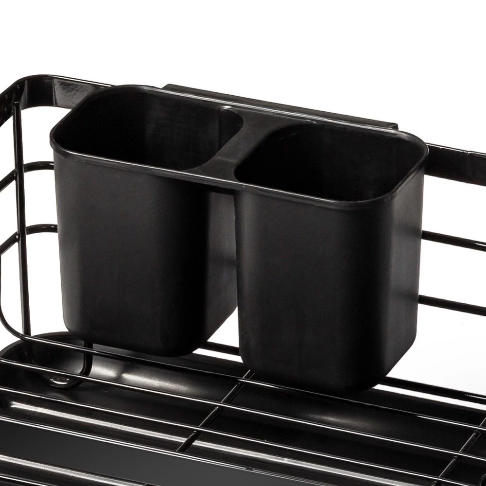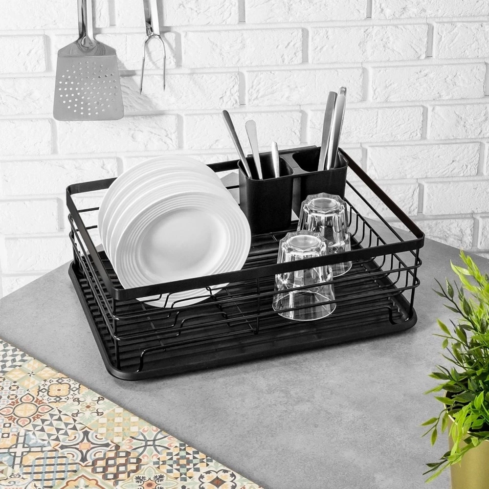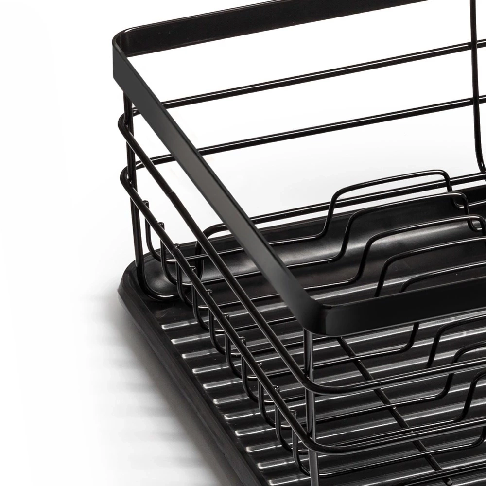 - Elegancka suszarka do naczyń w kolorze czarnym. Wykonana z nierdzewnego metalu. Posiada miejsce na talerze, szklanki oraz sztućce. Wyposażona w wyjmowaną tacę ociekową.
