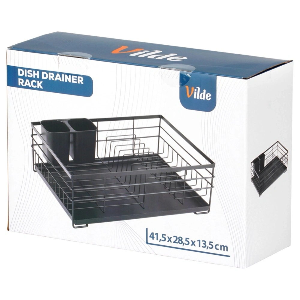Kompaktowa suszarka na naczynia z miejscem na talerze, kubki oraz sztućce. Wykonana z wytrzymałych materiałów. Dzięki niej zapomnisz o nieuporządkowanych naczyniach i mokrych śladach na blacie szafek przy zlewie. Suszarka to niezbędny element wyposażenia kuchni. Wykonana w eleganckim stylu, a zarazem funkcjonalna. Łatwa w czyszczeniu. Posiada wyjmowaną tacę ociekową, dzięki czemu utrzymanie jej w czystości nie stanowi problemu. Oryginalny produkt marki Vilde. Wyprodukowano zgodnie z europejskimi standardami.