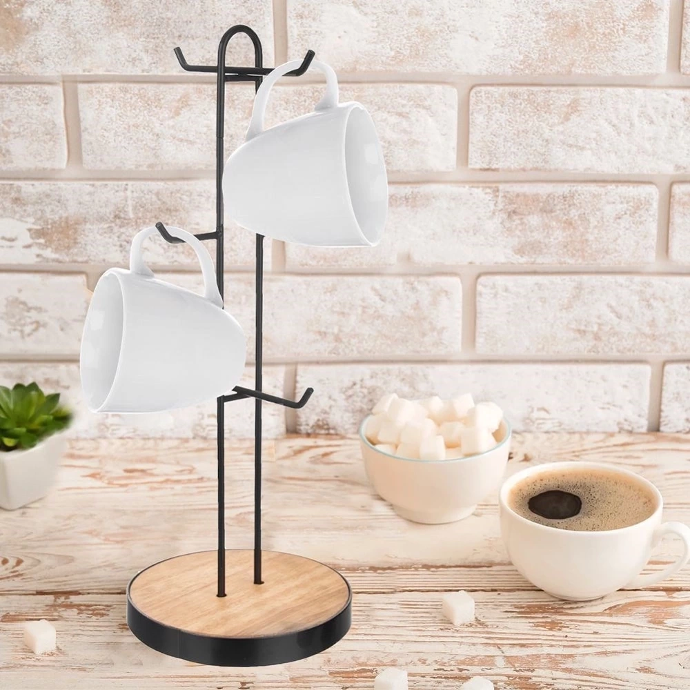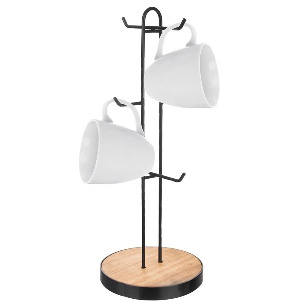 - Stojak na 6 kubków lub filiżanek. Wykonany z metalu w kolorze czarnym a podstawa z drewna. Dzięki niemu w piękny sposób wyeksponujesz ulubione kubki.