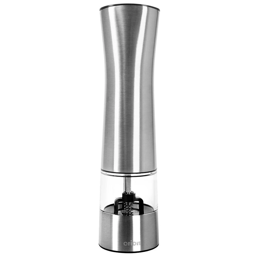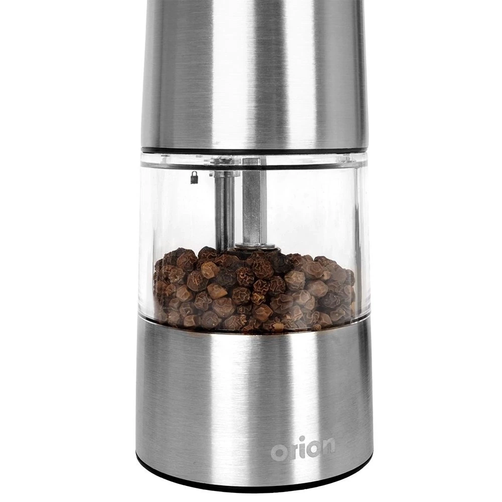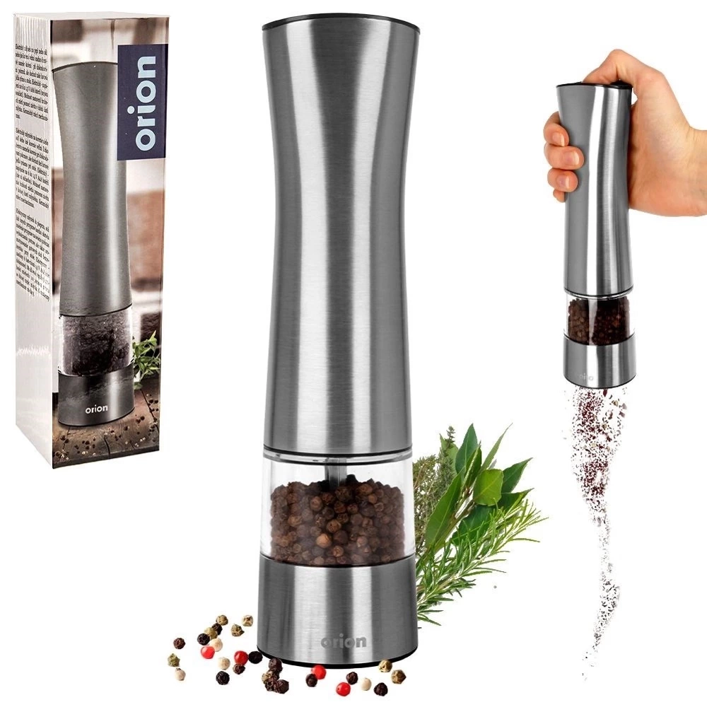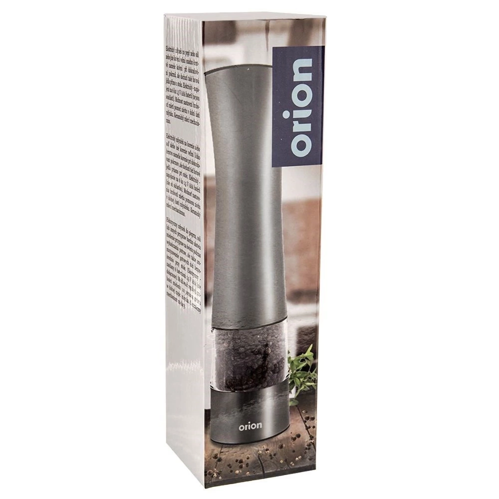 Młynek elektryczny o wysokości 21,5 cm i średnicy 5,5 cm. Wykonany solidnie z najwyższej jakości materiałów. Obudowa młynku wykonana z najwyższej jakości stali nierdzewnej w kolorze srebrnym. Posiada chromowany przycisk uruchamiający mielenie oraz ceramiczny mechanizm mielący. Ceramiczny mechanizm mielący gwarantuje mielenie nawet najtwardszych ziaren. Młynek elektryczny sprawdzi się idealnie do mielenia soli, pieprzu lub innych przypraw. Zasilany 6x bateria 1,5V AAA. Młynek jest łatwy w obsłudze, mielenie uruchamia się za pomocą jednego przycisku, można bez problemu obsługiwać jedną ręką. Posiada możliwość regulacji mielonych ziaren, wyposażony również w blokadę, która uniemożliwi uruchomienie młynka przez dzieci w nieodpowiednim momencie. Młynek prezentuje się bardzo elegancko, odpowiednio wyprofilowany kształt pozwoli na wygodne użytkowanie. Mielenie przypraw bezpośrednio przed dodaniem ich do dań pozwoli na wydobycie świeżego aromatu. Oryginalny produkt czeskiej marki Orion. Wyprodukowano zgodnie z europejskimi standardami.