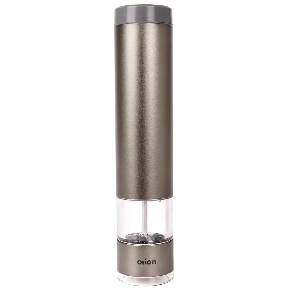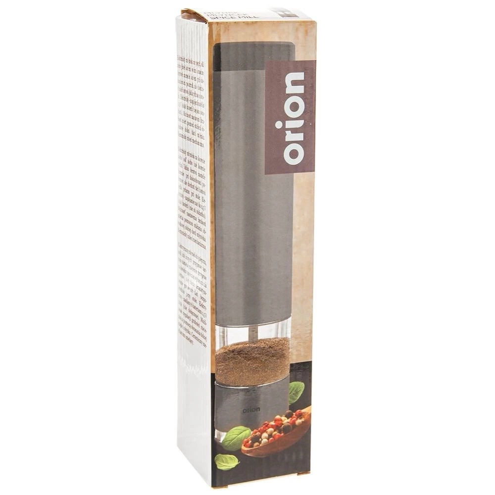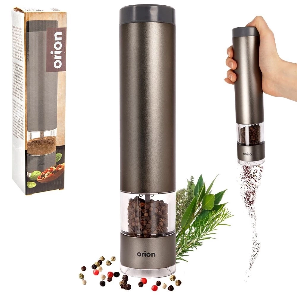 Młynek elektryczny o wysokości 22,5 cm i średnicy 4,5 cm. Wykonany solidnie z najwyższej jakości materiałów. Obudowa młynku wykonana z aluminium w kolorze grafitowym. Posiada stalowy przycisk uruchamiający mielenie oraz ceramiczny mechanizm mielący. Ceramiczny mechanizm mielący gwarantuje mielenie nawet najtwardszych ziaren. Młynek elektryczny sprawdzi się idealnie do mielenia soli, pieprzu lub innych przypraw. Zasilany 6x bateria 1,5V AAA. Młynek jest łatwy w obsłudze, mielenie uruchamia się za pomocą jednego przycisku, można bez problemu obsługiwać jedną ręką. Posiada możliwość regulacji mielonych ziaren, wyposażony również w blokadę, która uniemożliwi uruchomienie młynka przez dzieci w nieodpowiednim momencie. Młynek prezentuje się bardzo elegancko, odpowiedni kształt pozwoli na wygodne użytkowanie. Mielenie przypraw bezpośrednio przed dodaniem ich do dań pozwoli na wydobycie świeżego aromatu. Oryginalny produkt czeskiej marki Orion. Wyprodukowano zgodnie z europejskimi standardami.